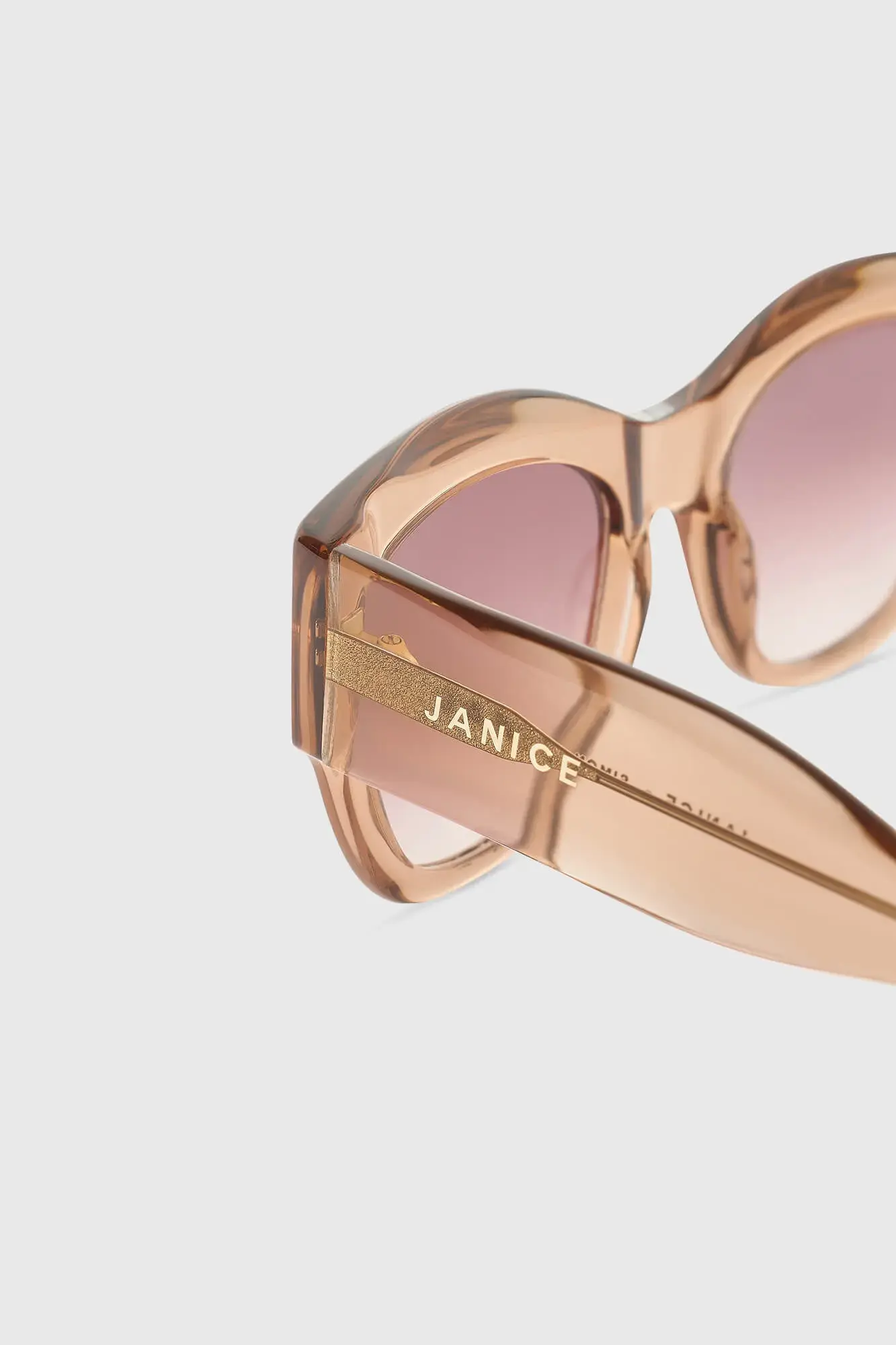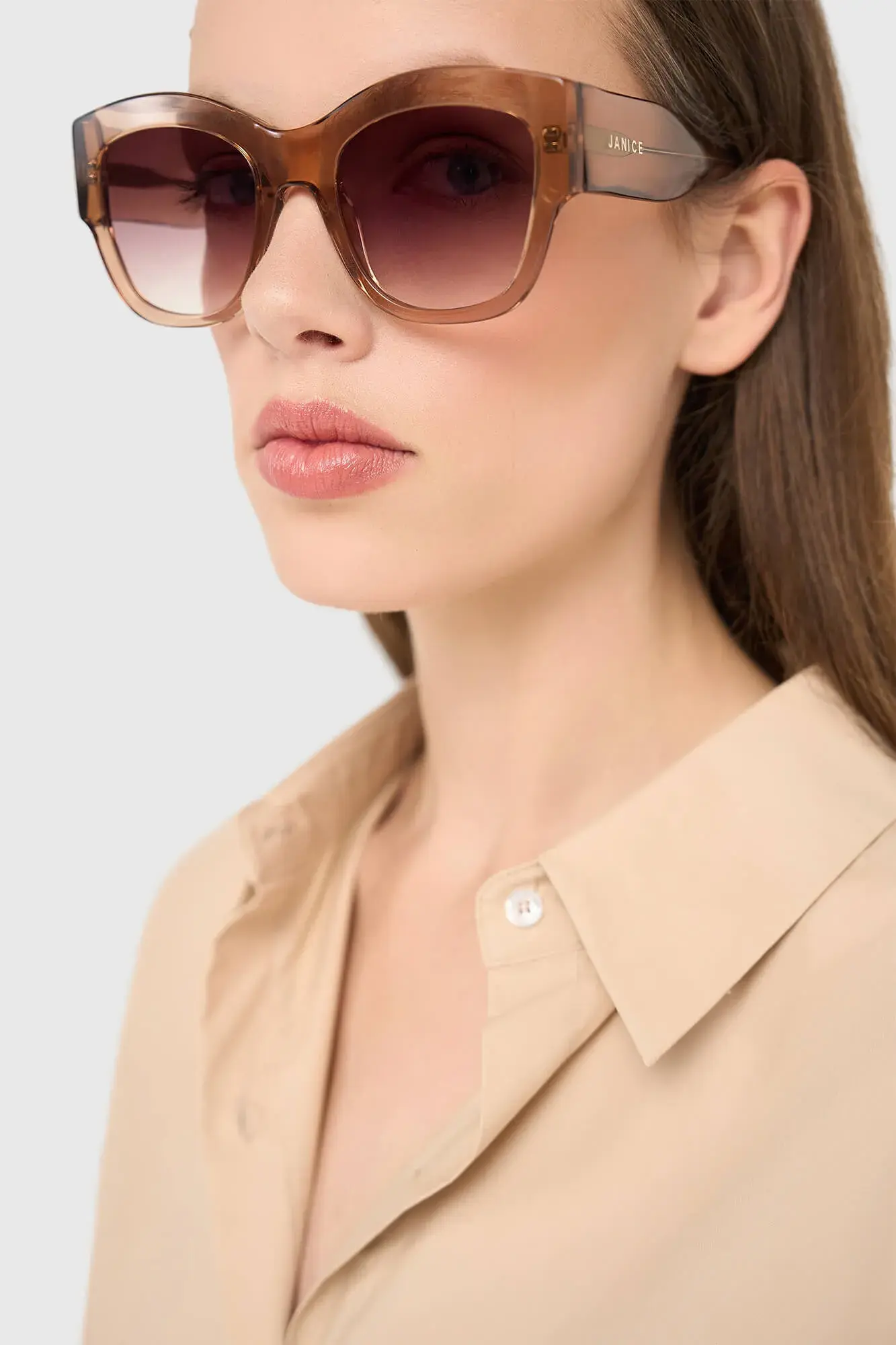 Deze dames zonnebril heeft een verfijnde vorm die subtiel de gelaatstrekken volgt. Door het gebruik van acetaat behoudt het montuur vormvastheid en een luxe uitstraling zonder overheersend aanwezig te zijn. Dit past volledig binnen de gedachte van stille elegantie waar JANICE om bekendstaat. De zonnebril is ontworpen om een stijlvolle finishing touch te geven aan zowel minimalistische als meer uitgesproken outfits.