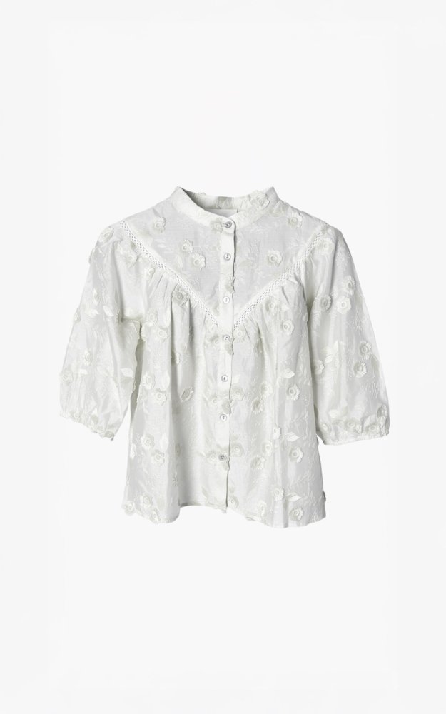 De Canna blouse is een feestelijk blousje in frisse, lichte kleuren. De luchtige uitstraling en verfijnde stof maken dit item perfect voor speciale momenten.