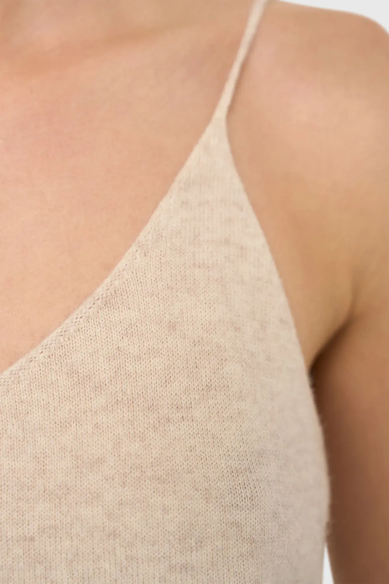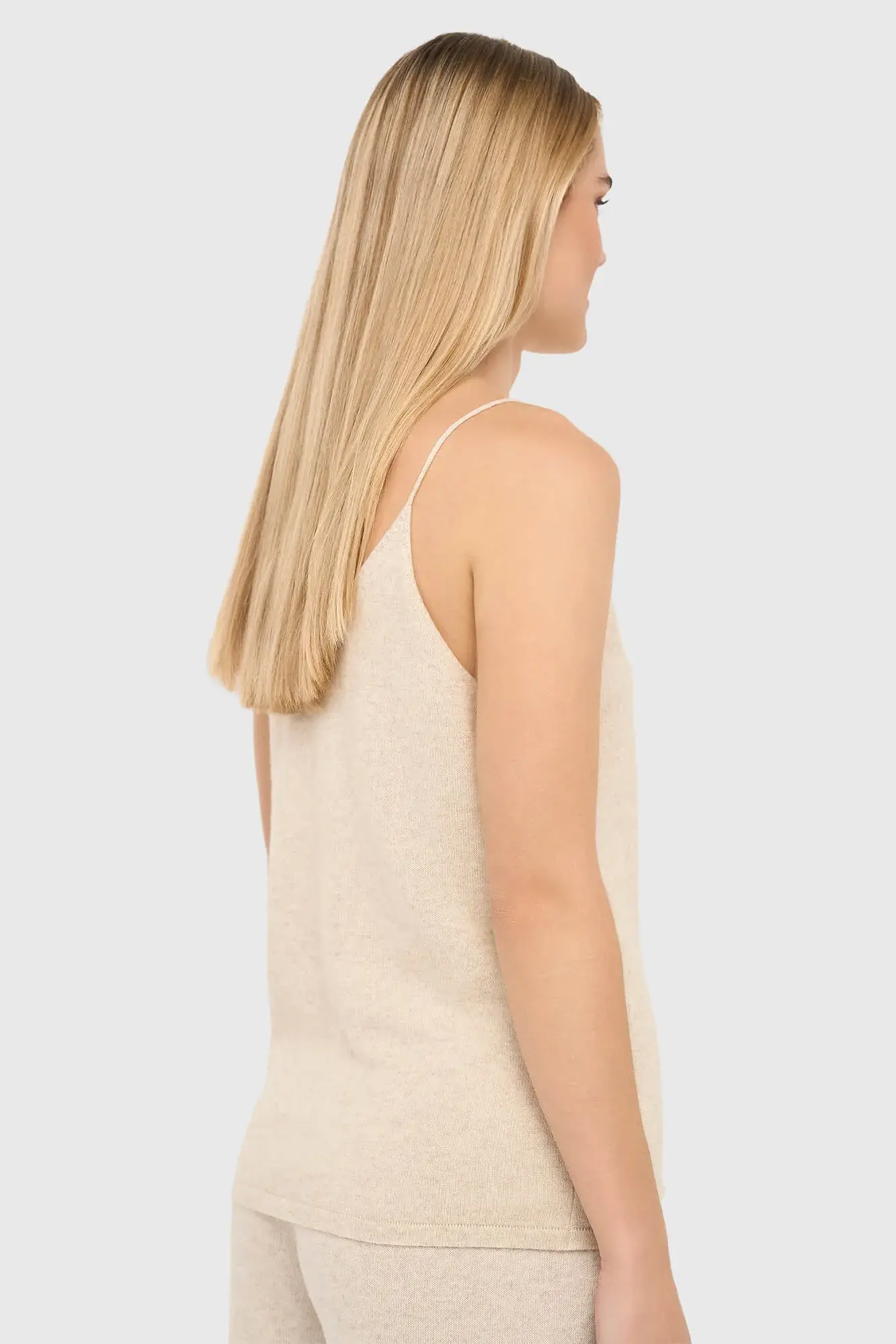 De cashmere gebreide tanktop BLANE beige van JANICE is een luxe dames top die ontworpen is met aandacht voor comfort, stijl en verfijning. Deze knitwear essential is gemaakt van een hoogwaardige blend van 90% wol en 10% cashmere, waardoor de top zacht aanvoelt op de huid en een elegante, tijdloze uitstraling heeft. De warme beige tint past binnen elke garderobe en sluit perfect aan bij de ingetogen luxe die zo kenmerkend is voor JANICE.