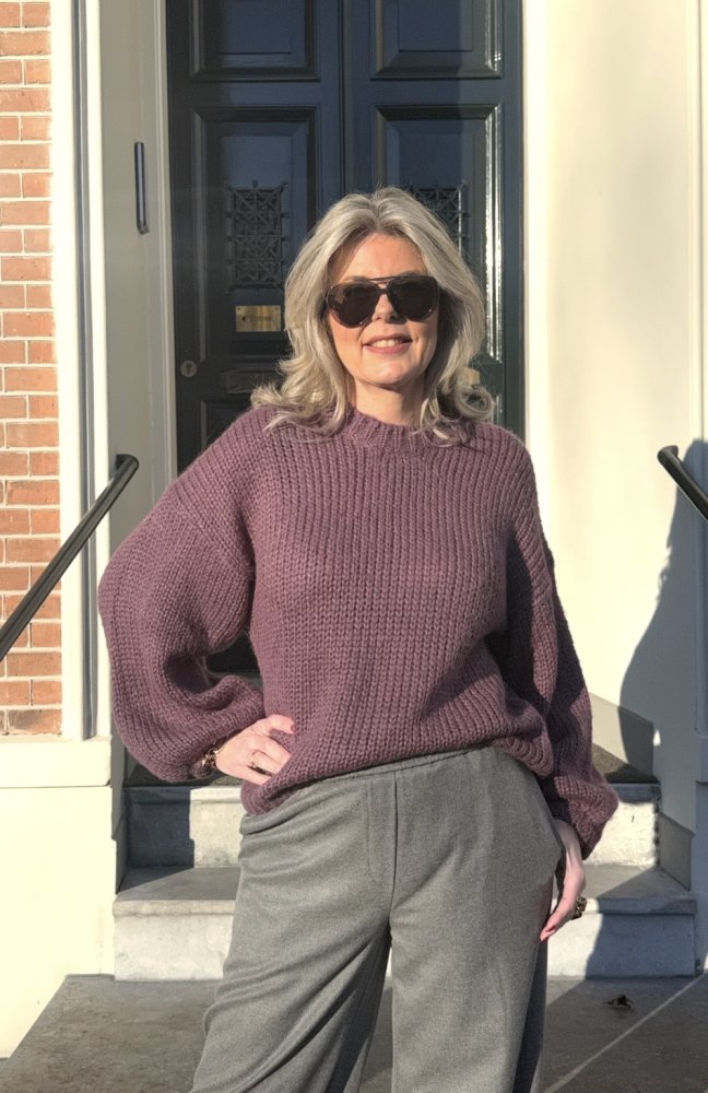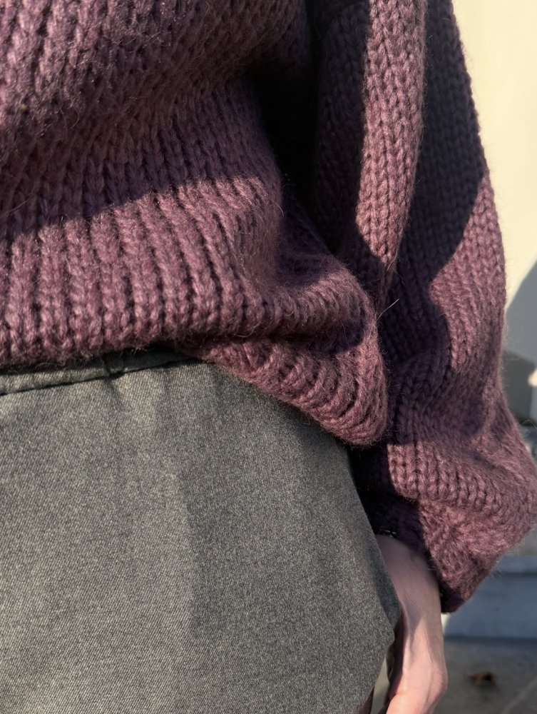 Breisel gemaakt uit een wolmix, met een losse pasvorm en afgezakte schouders. Het breisel heeft pofmouwen, een lichte rib langs de manchetten en aan de onderkant.