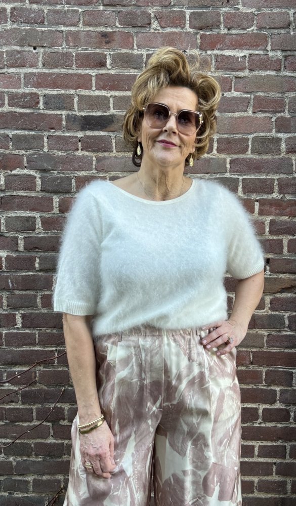 Rachel is een trui in t-shirtstijl van 100% luxueuze geborstelde kasjmierwol. Het heeft een brede halslijn, brede mouwen en een ontspannen pasvorm, wat zorgt voor een moeiteloos elegante en verfijnde silhouet.