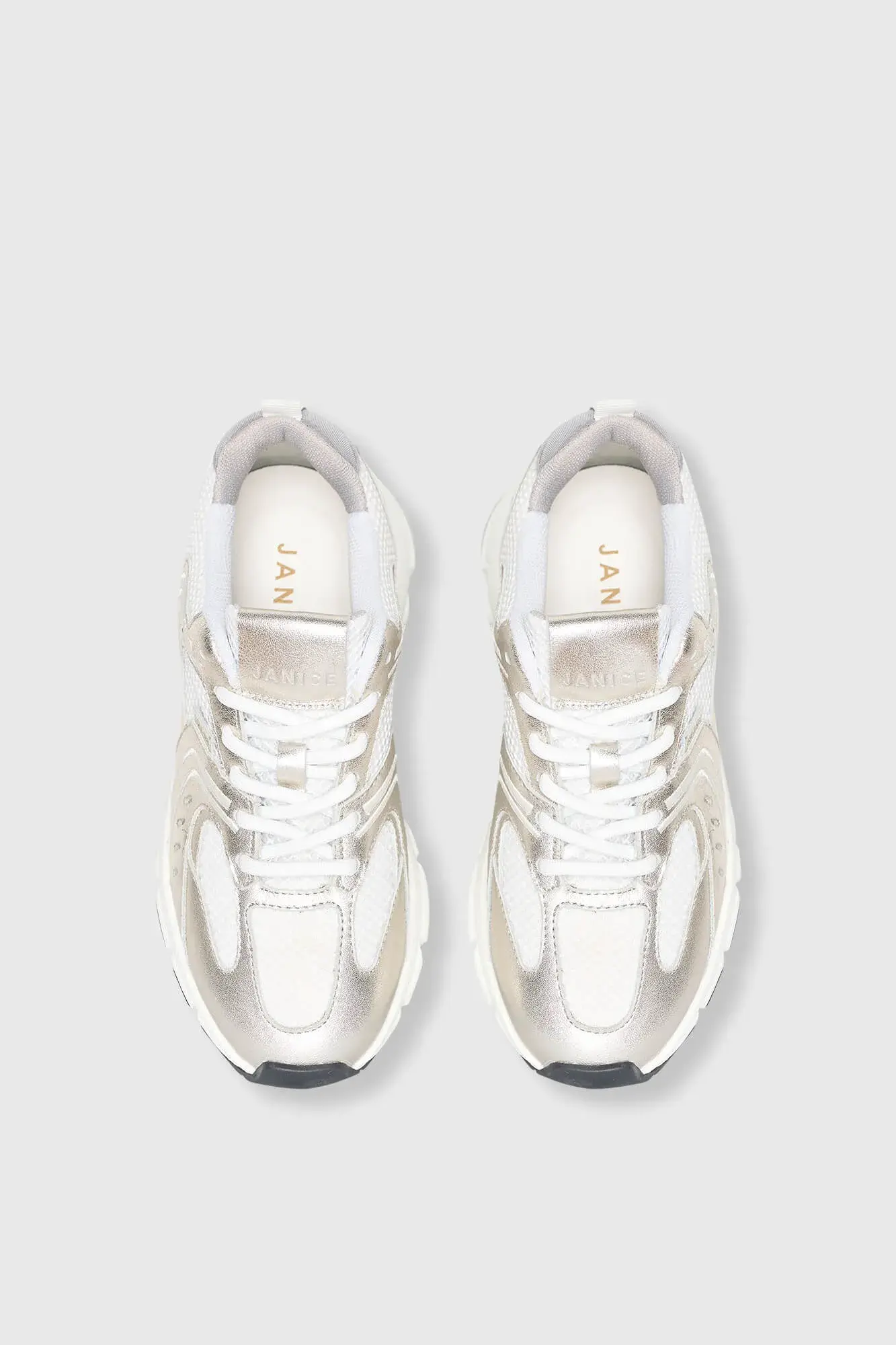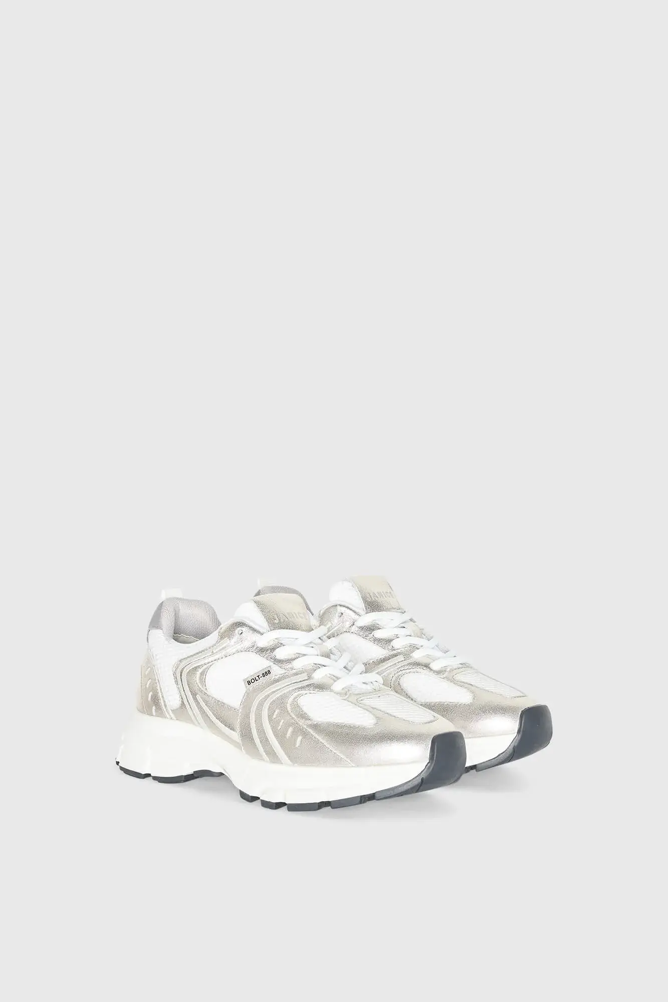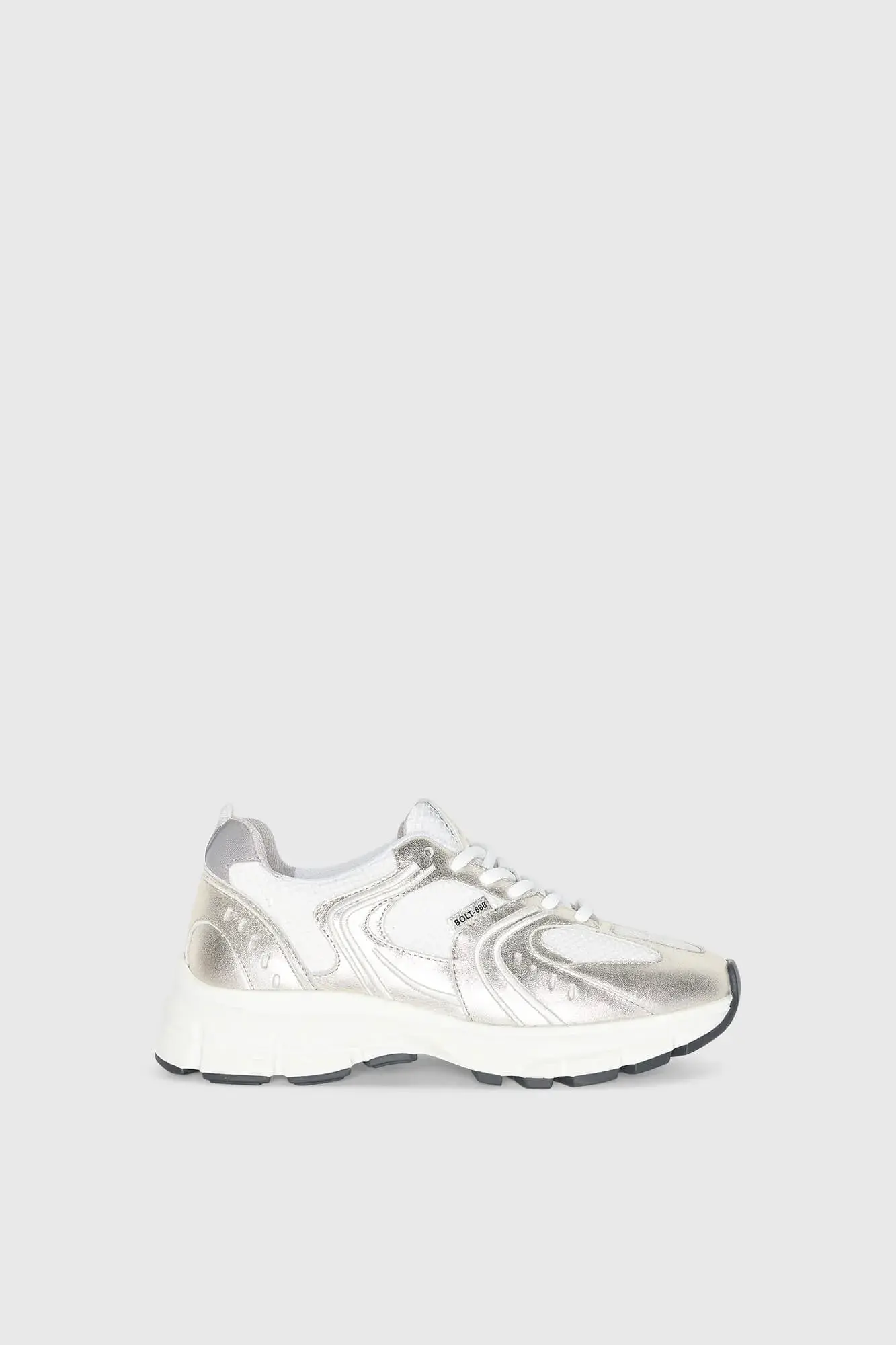 De sneakers hebben een retro runner silhouet dat is ontworpen voor dagelijks comfort. De tussenzool zorgt voor een fijne demping bij iedere stap en ondersteunt het lopen op een subtiele, soepele manier zoals ook terug te zien is bij andere BOLT modellen in de collectie . Door de sluiting ontstaat een aansluitende fit waardoor dit paar ideaal is voor lange dagen waarop stijl en comfort samen moeten komen. De zool vormt een sportief contrast met het zilveren leer, waardoor deze luxe dames schoenen zowel modern als tijdloos blijven.