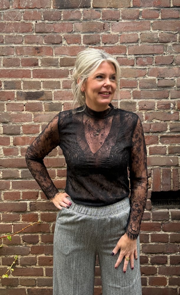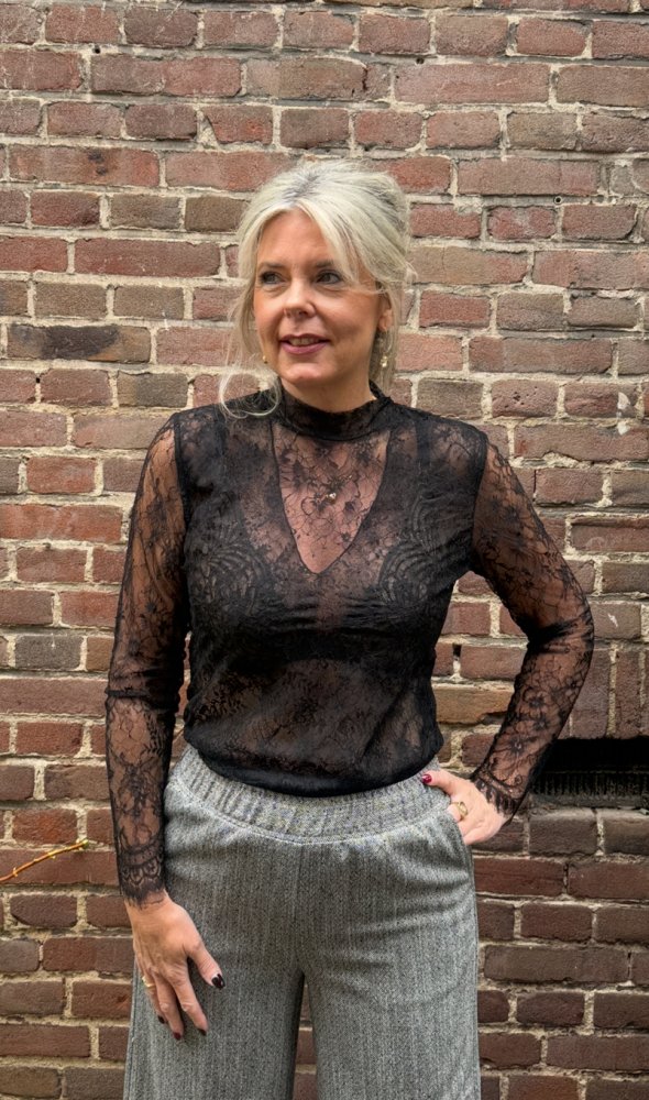 CMLEA-BLOUSE is een nauwsluitende blouse van een premium kantmateriaal met een hoge hals, verborgen ritssluiting aan de achterkant, lange mouwen met kanten rand en een binnentop met een diepe V-hals.