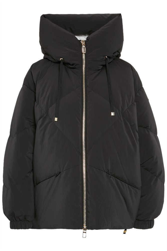 Oversized kort donsjack van nylon microvezel met stiksels met geometrisch patroon. Verlaagde schouder, sluiting aan de voorkant met dubbele metalen ritssluiting en zakken met onzichtbare rits ingevoegd in het gewatteerde patroon. Mouwzoom met elastische band verborgen in de manchet en trekkoord om de zoom en capuchon aan te passen.