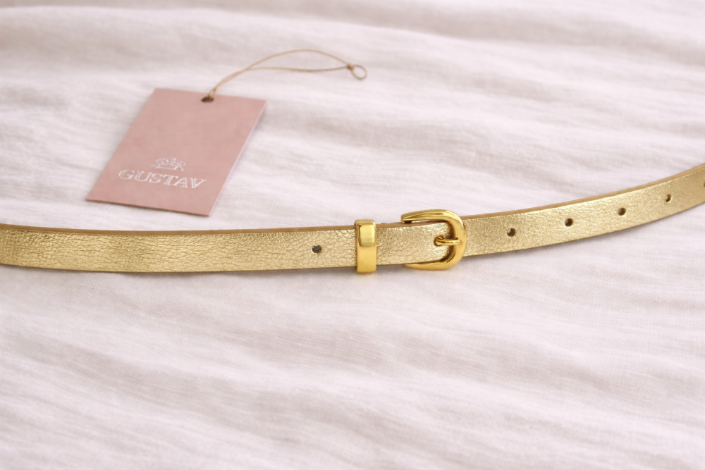 Een subtiel detail dat direct het verschil maakt. Deze Gloe riem van Gustav in goud leer geeft je outfit een verfijnde, luxe uitstraling zonder te overheersen.