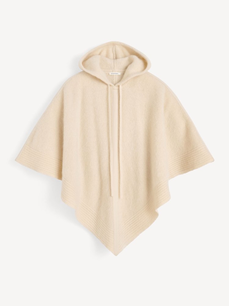 Gelaagd over de blouses, blazers en lichtere bovenkleding van het seizoen, voegt een eclectische cape - zoals het Viggo-ontwerp - zowel warmte als diepte toe. Het driehoekige silhouet is gemaakt van een wolmix en is afgewerkt met een grote capuchon, striksluiting en grafische panelen.