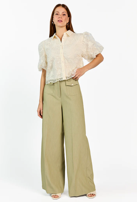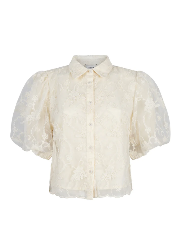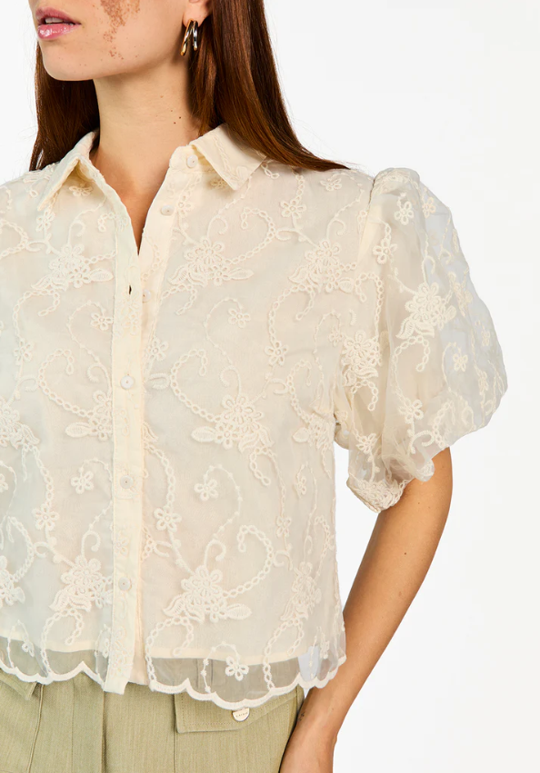 Deze luchtige blouse is uitgevoerd in een verfijnde, transparante stof met rijk geborduurd bloemmotief. Het korte model heeft een klassieke kraag, knoopsluiting en halflange pofmouwen voor een vrouwelijke uitstraling. De subtiel geschulpte zoom geeft een speelse afwerking. Perfect te combineren met een high-waisted broek of rok voor een elegante, zomerse look.