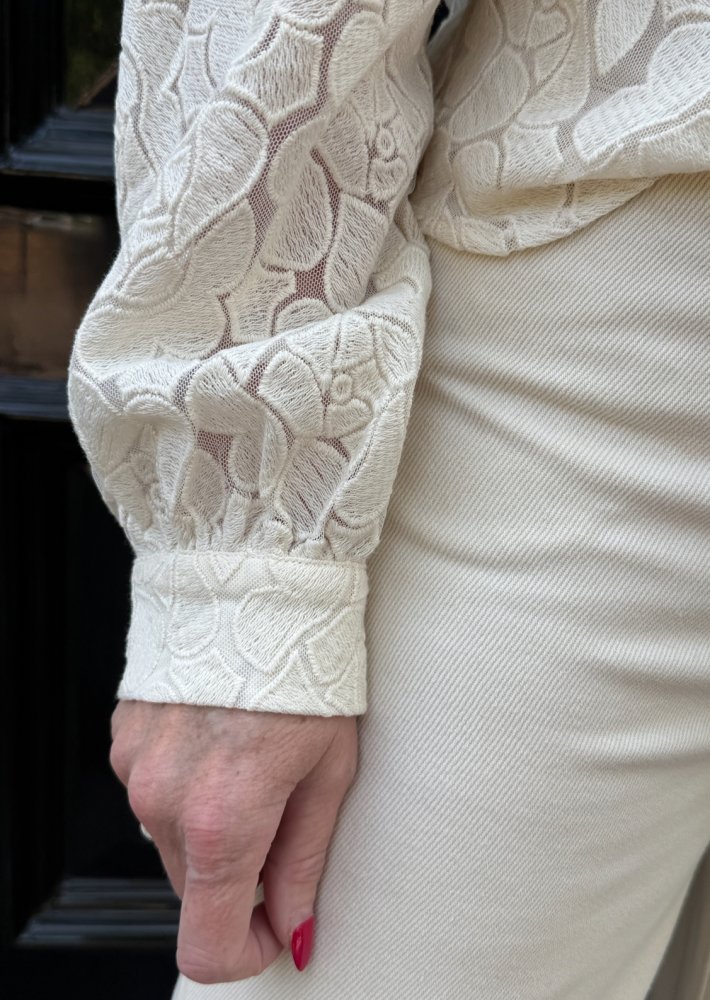 Blouse Lexie is uitgevoerd in een rijke jacquardstof met bloemenstructuur. De hoge hals met strikdetail maken de blouse een eyecatcher die elke alledaagse look afmaakt. Perfect te combineren met broek Sonja.
