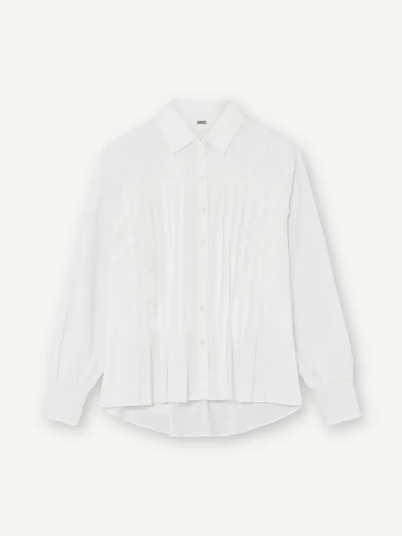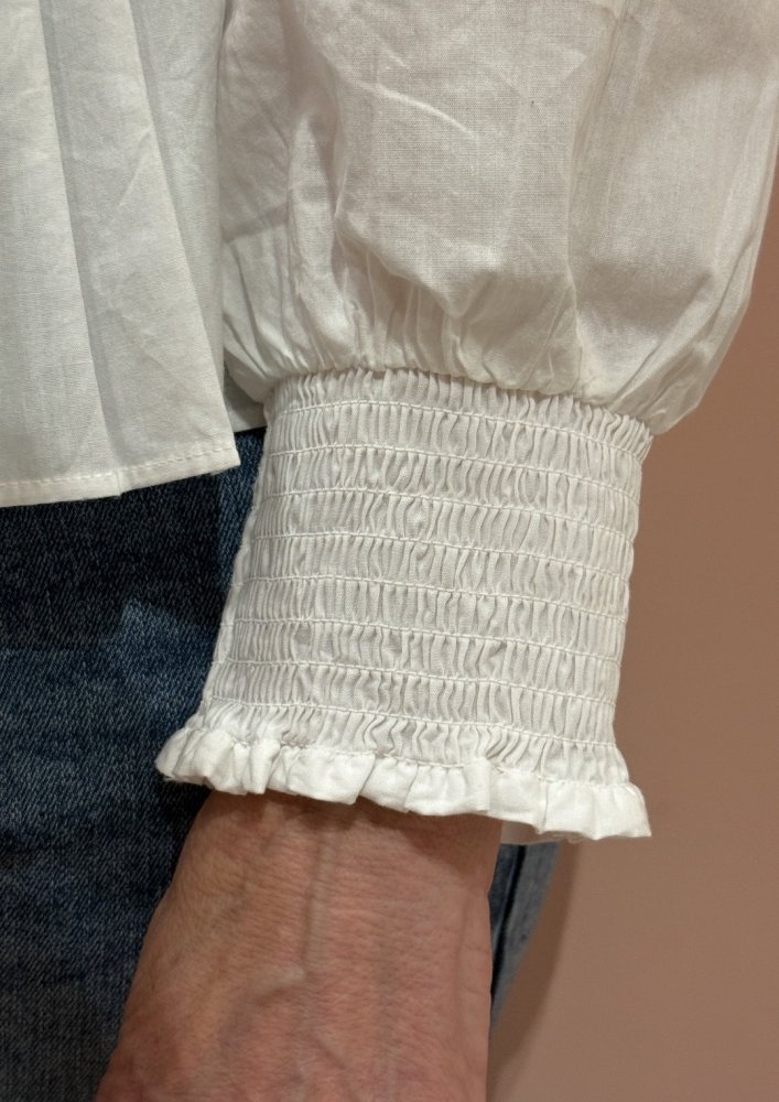 De combinatie van klassiek borduurwerk en speelse plooien maakt deze blouse een echte eyecatcher voor elke dag.