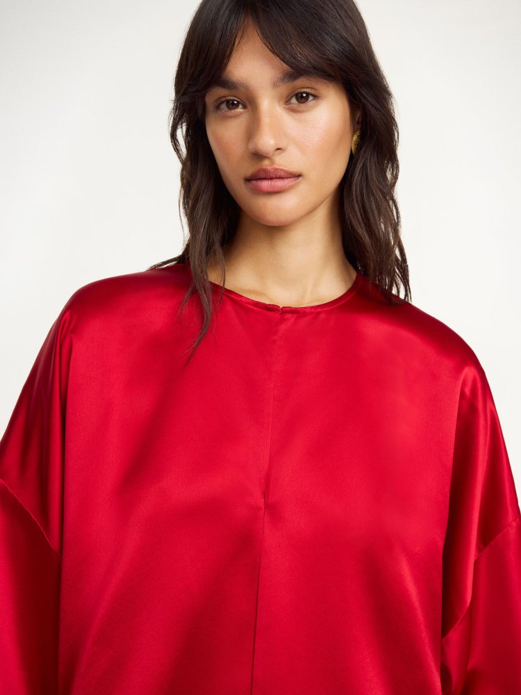 Verfijning en gemak definiëren de Cicie-blouse. Gemaakt om elegantie toe te voegen aan zowel werk- als avondkleding, het satijnen ontwerp heeft verlaagde schouders, brede cropped mouwen en een diepe halslijn die kan worden gesloten met een discrete sluiting.