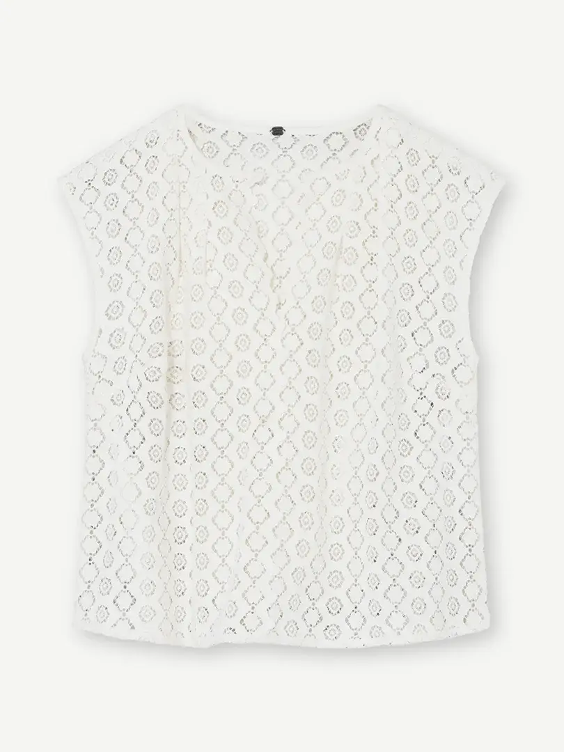 Deze elegante Gustav top in bright white is een frisse en vrouwelijke toevoeging aan je garderobe. De verfijnde opengewerkte structuur geeft de top een luchtige en luxe uitstraling, perfect voor zonnige dagen of een stijlvolle laag onder een jasje.