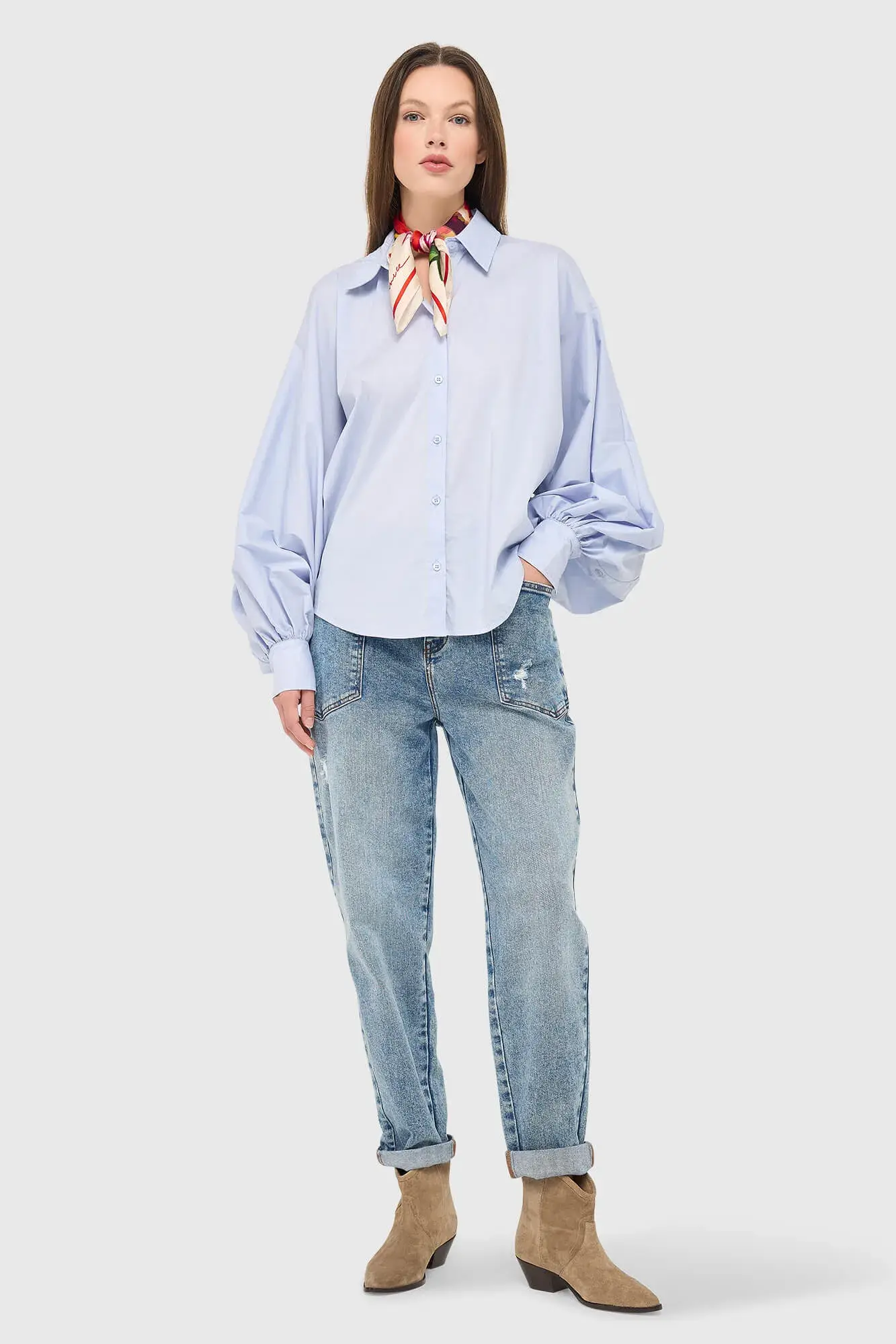 De blouse dames katoen blauw tone pofmouw cut out van JANICE is een moderne, luxe dames blouse die direct opvalt door de vrouwelijke details en de rijke uitstraling. Deze elegante blouse is gemaakt van een hoogwaardige katoenmix die comfortabel aanvoelt en door de toevoeging van nylon en spandex een mooie structuur en subtiele flexibiliteit heeft. De blouse heeft een kraag en een klassieke knoopsluiting, uitgevoerd in een tijdloze blauwe kleur die eenvoudig te combineren is. De raglan mouwen lopen over in een royale pof, wat zorgt voor extra volume en een verfijnde silhouetlijn. De hogere manchetten sluiten mooi aan en geven het geheel een elegante afwerking die past binnen het gevoel van silent luxury.