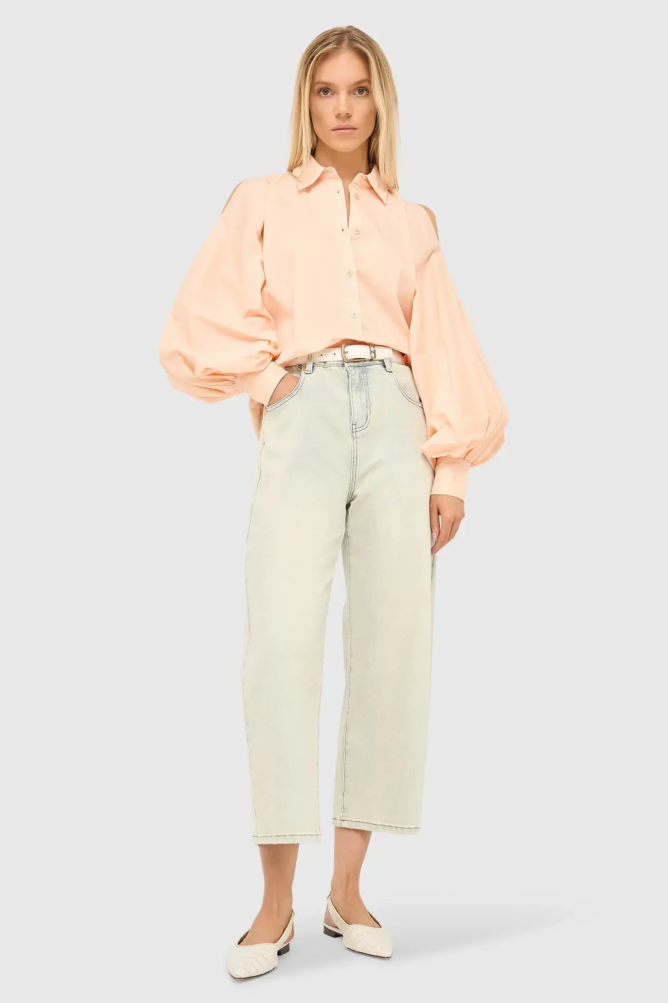 De Shop de peachkleurige STONE CUT OUT dames blouse van JANICE nu online en ervaar de luxe van een hoogwaardige basic met een moderne pofmouw.