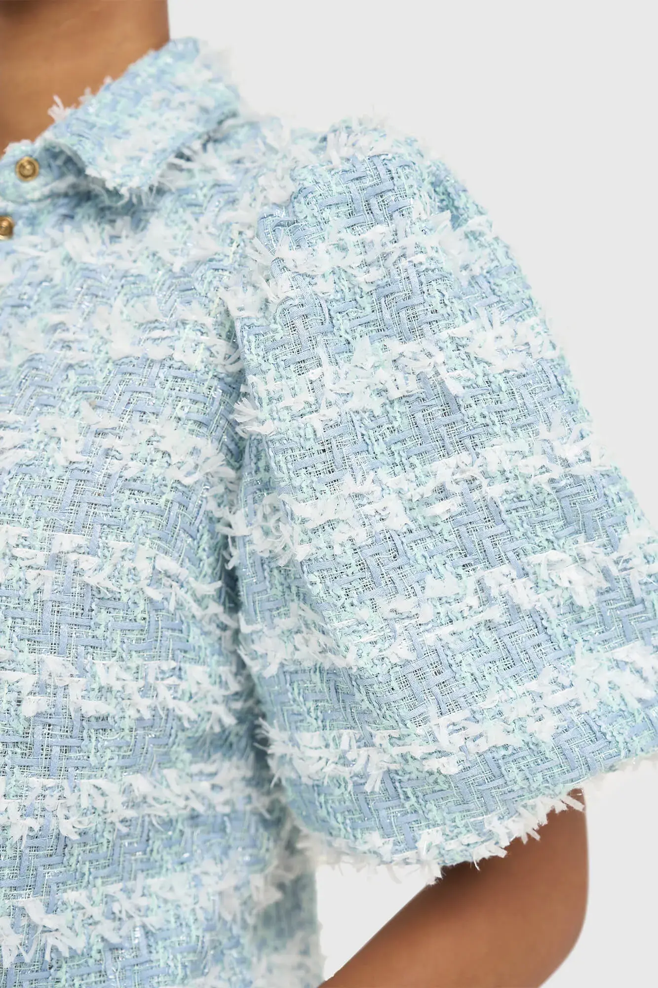Dankzij het multicolor tweed effect heeft deze dames blouse een uitgesproken en luxe uitstraling. De kleurcombinatie is subtiel en elegant, perfect voor wie houdt van kwaliteitsitems die een statement maken zonder schreeuwerig te zijn. De pofmouw voegt extra volume toe en maakt deze luxe dames blouse geschikt voor verschillende gelegenheden, van een lunchafspraak tot een avond uit.