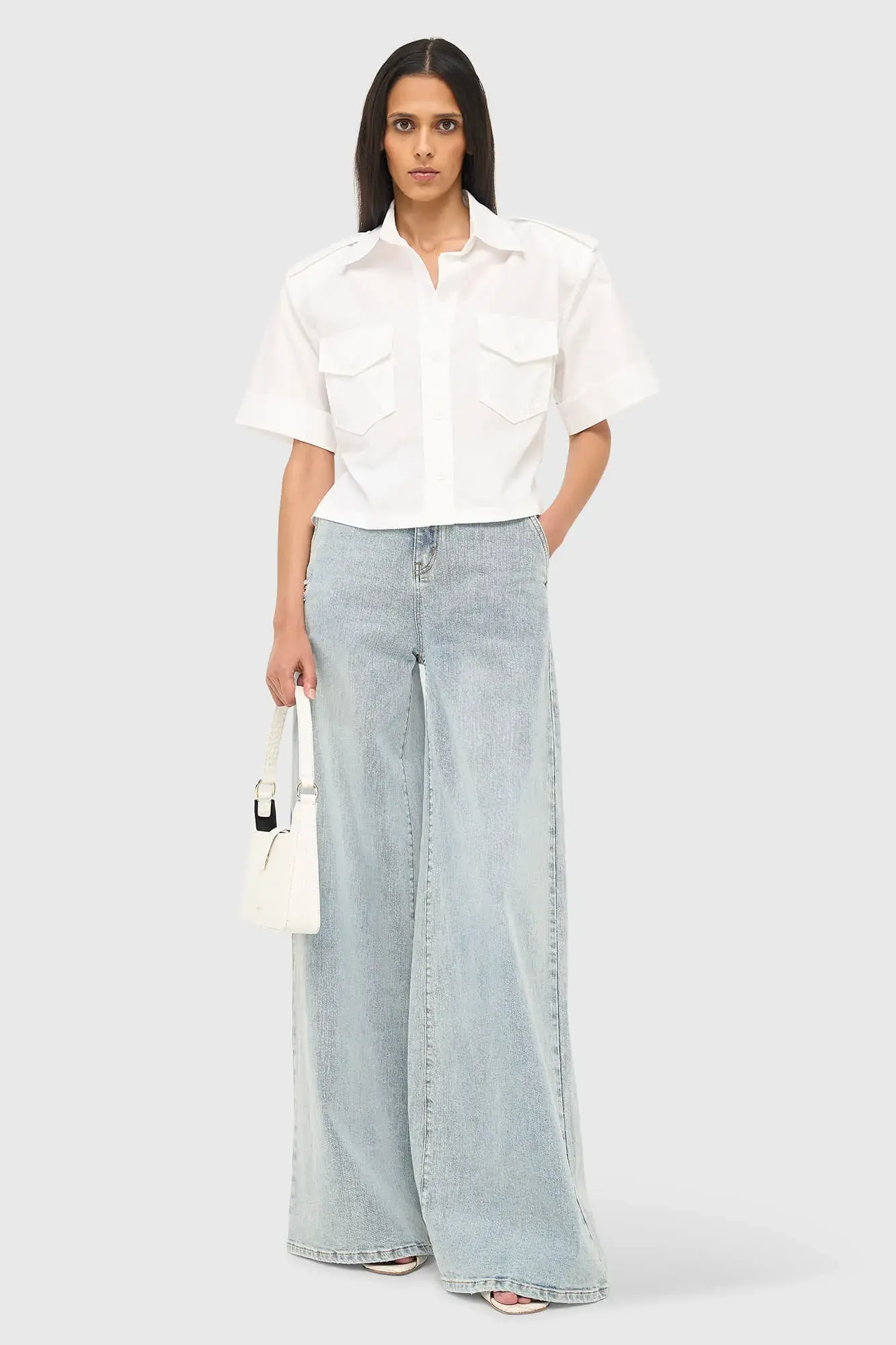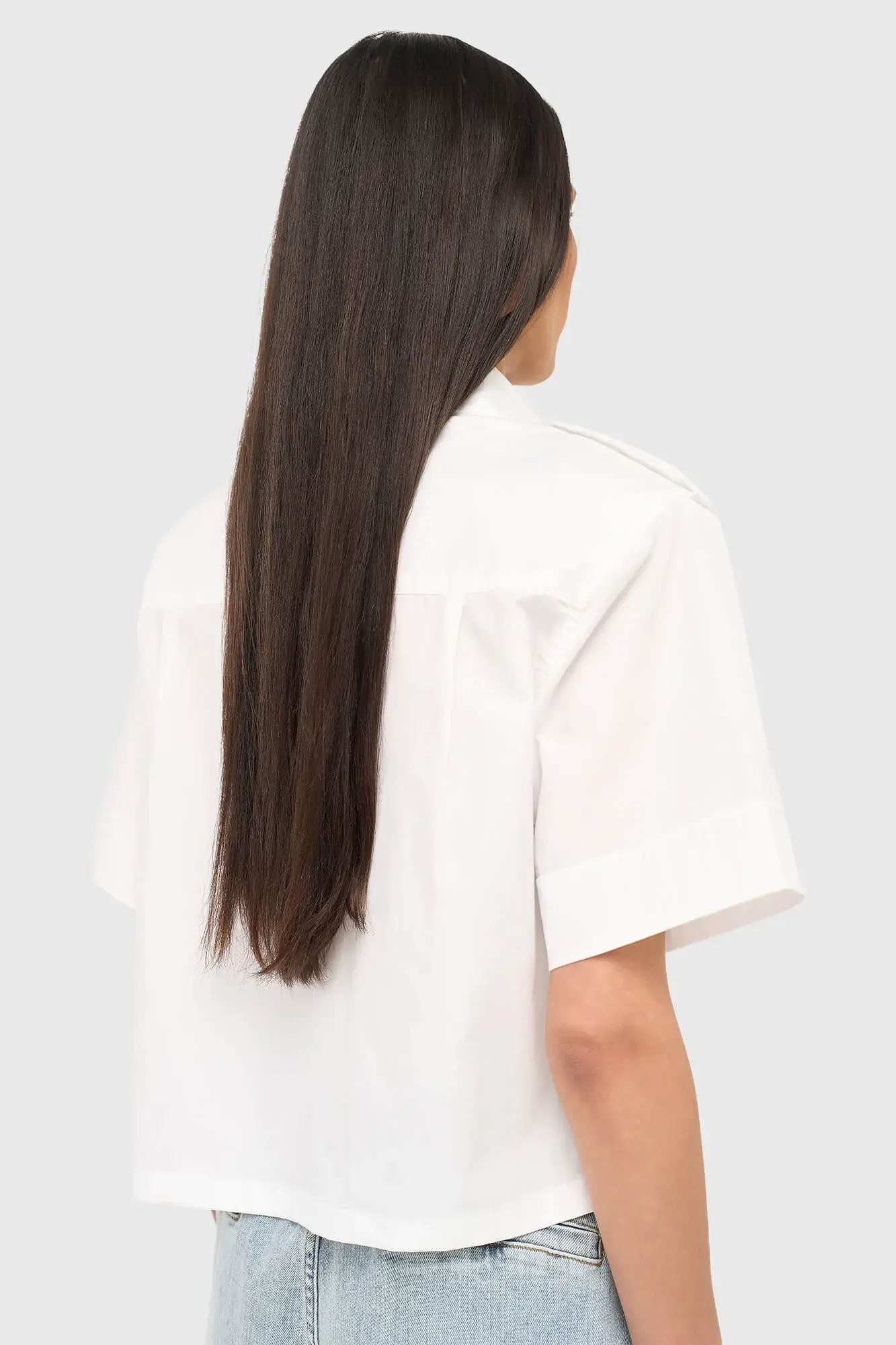 Het zachte katoenen materiaal voelt licht en natuurlijk aan, waardoor de blouse ideaal is om het hele jaar door te dragen. De korte lengte maakt het een veelzijdig item dat moeiteloos combineert met zowel hoge broeken als denim. De schoudervulling geeft de blouse een krachtige, maar vrouwelijke vorm, zonder dat het product zijn minimalistische uitstraling verliest. Deze luxe dames blouse past perfect bij de stijl van vrouwen die houden van hoogwaardige basics met een moderne twist.
