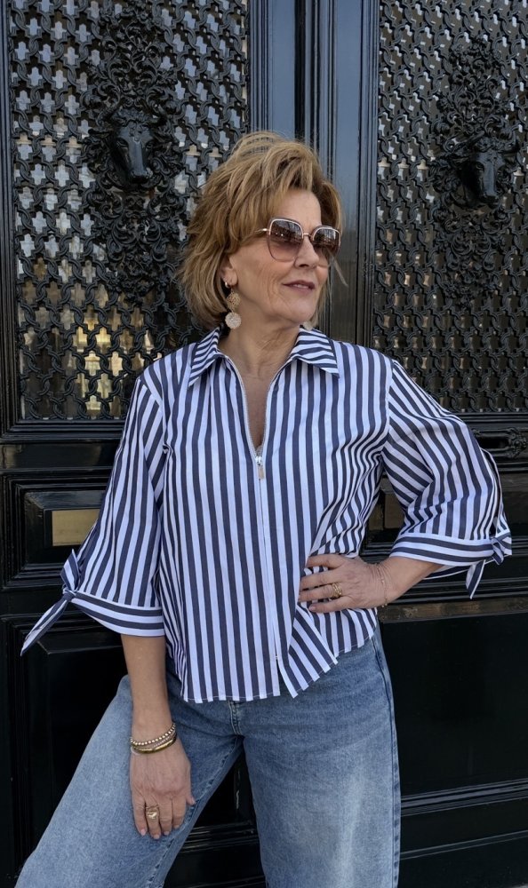 De blouse is uitgevoerd in een frisse streep en afgewerkt met een subtiele rits, wat zorgt voor een eigentijdse en iets sportievere uitstraling.