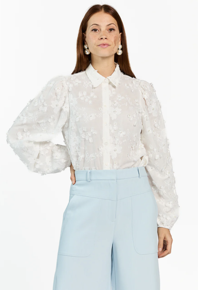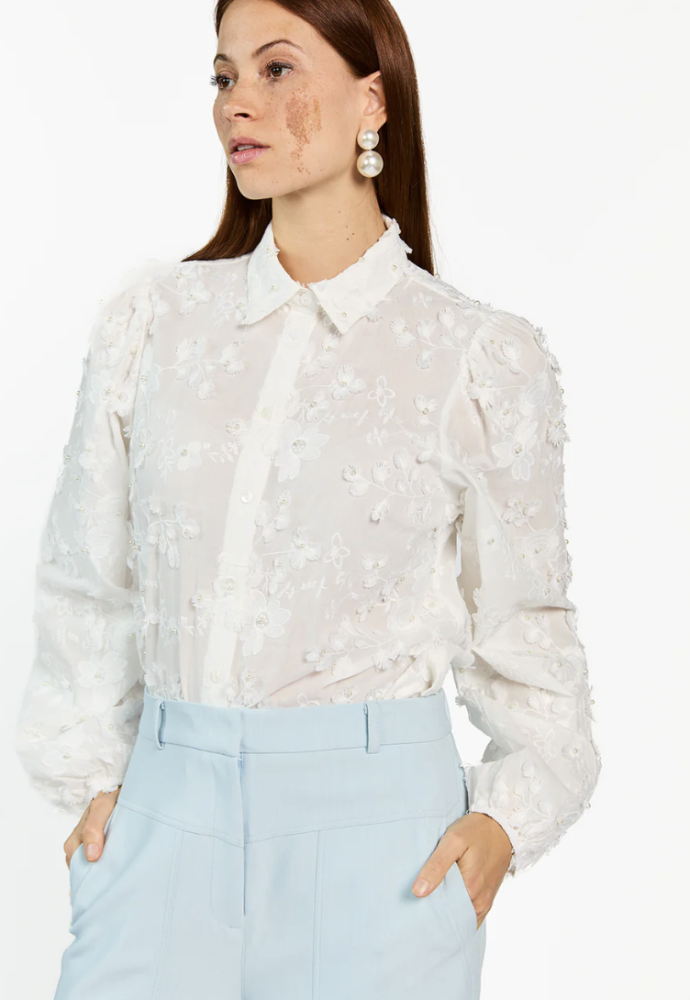 De Lien blouse is gemaakt van 100% organisch katoen en valt op door de bloemenapplicaties met kleine beads. De semi-transparante stof en pofmouwen geven de blouse een verfijnde uitstraling. Dankzij de rechte fit en klassieke kraag is het een veelzijdig item voor verschillende momenten. Combineer met de Harper broek voor een complete look