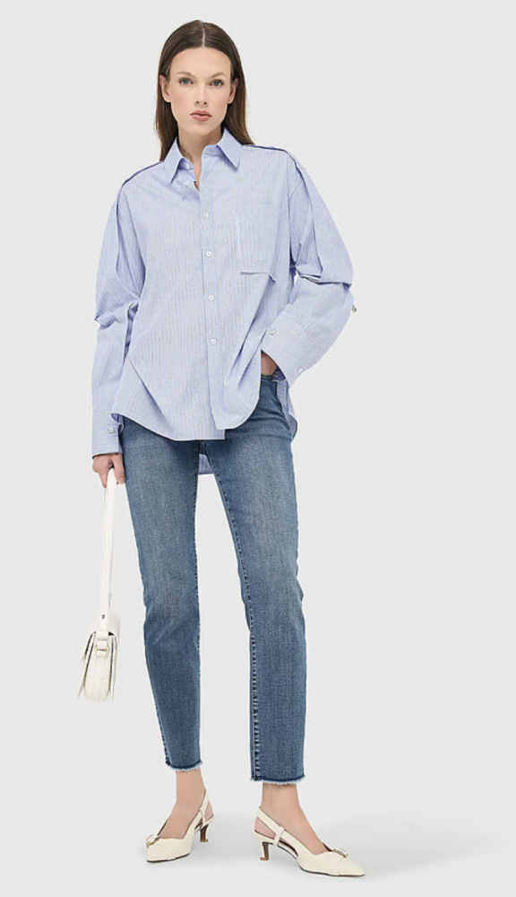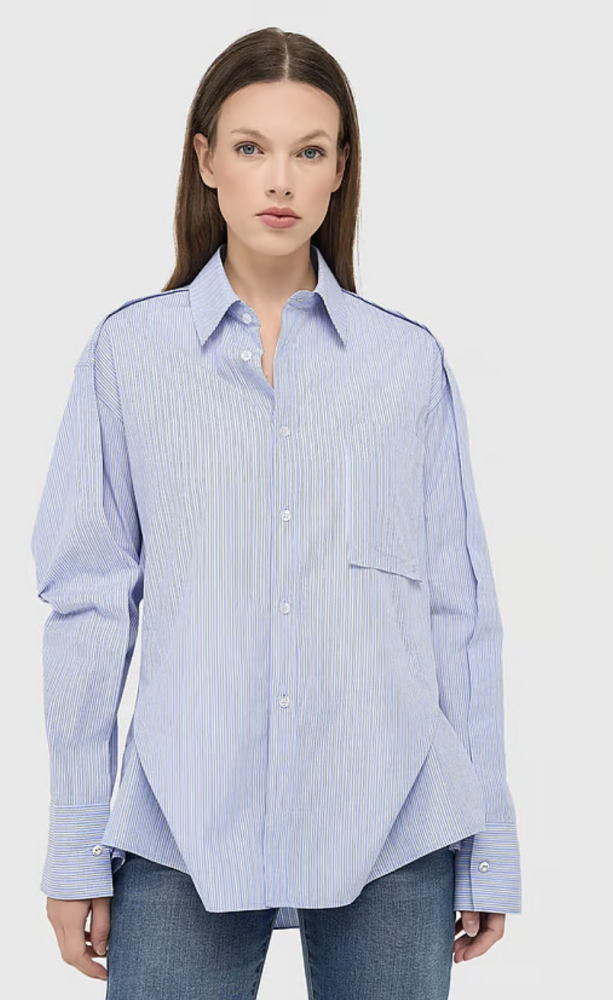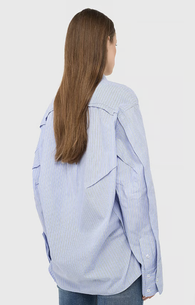 De frisse blauw-witte streep geeft de blouse een tijdloze en verzorgde uitstraling. De oversized pasvorm valt losjes om het lichaam en zorgt voor een ontspannen, maar stijlvolle look. De plooien aan de achterzijde creëren een subtiele balloon vorm die het geheel net dat beetje extra geeft.