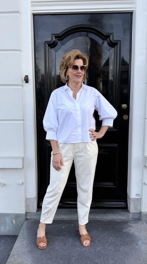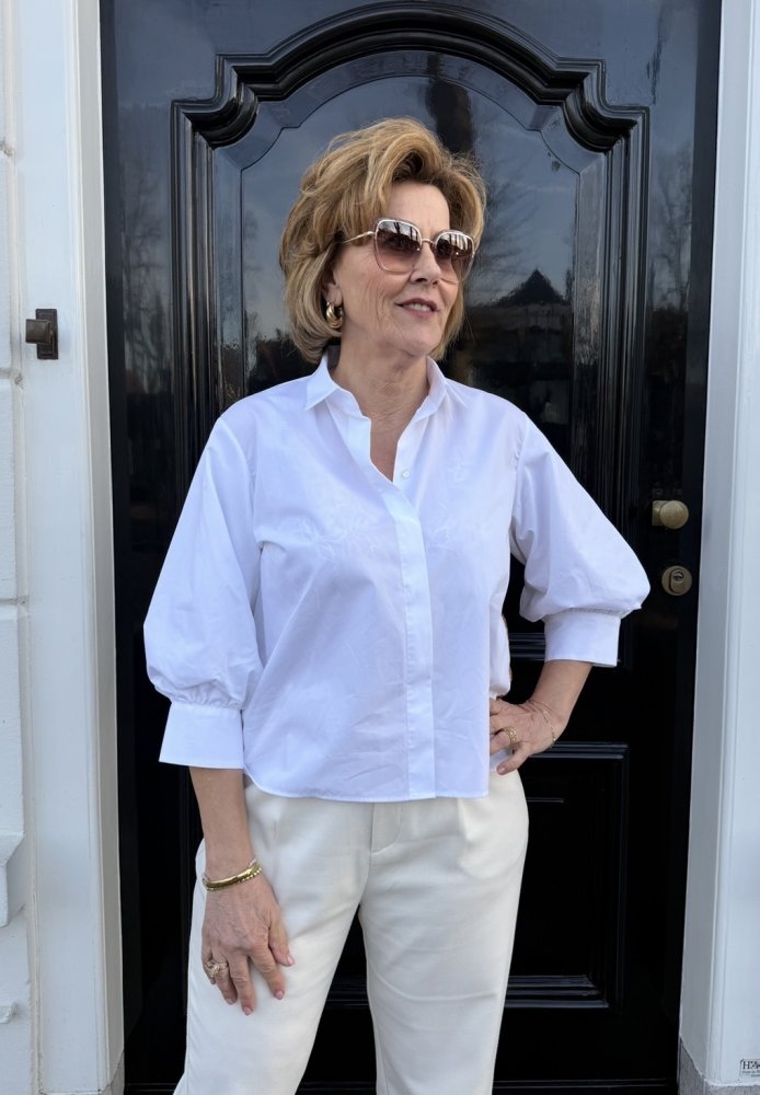 De blouse heeft vrouwelijke pofmouwen die zorgen voor een stijlvolle en moderne look.