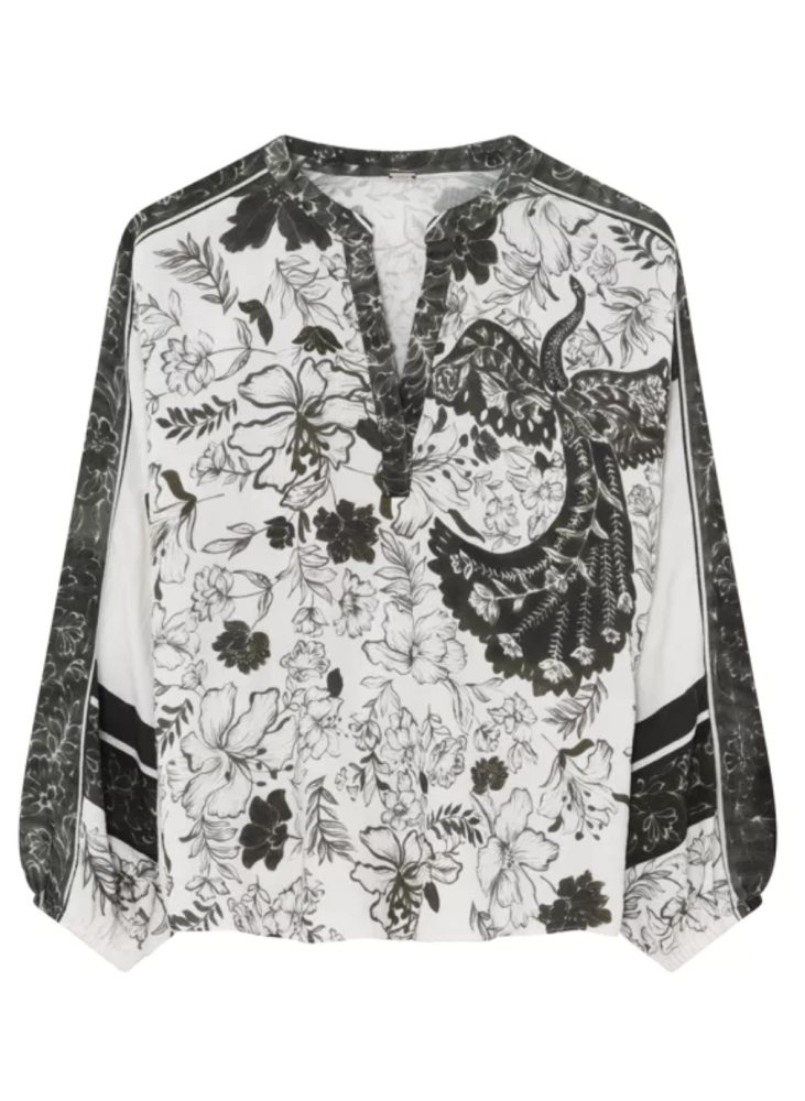 De combinatie van sierlijke bloemen en dierenprint in zachte tinten geeft deze blouse karakter zonder te schreeuwen. Mooi bij denim of ton-sur-ton met groen.
