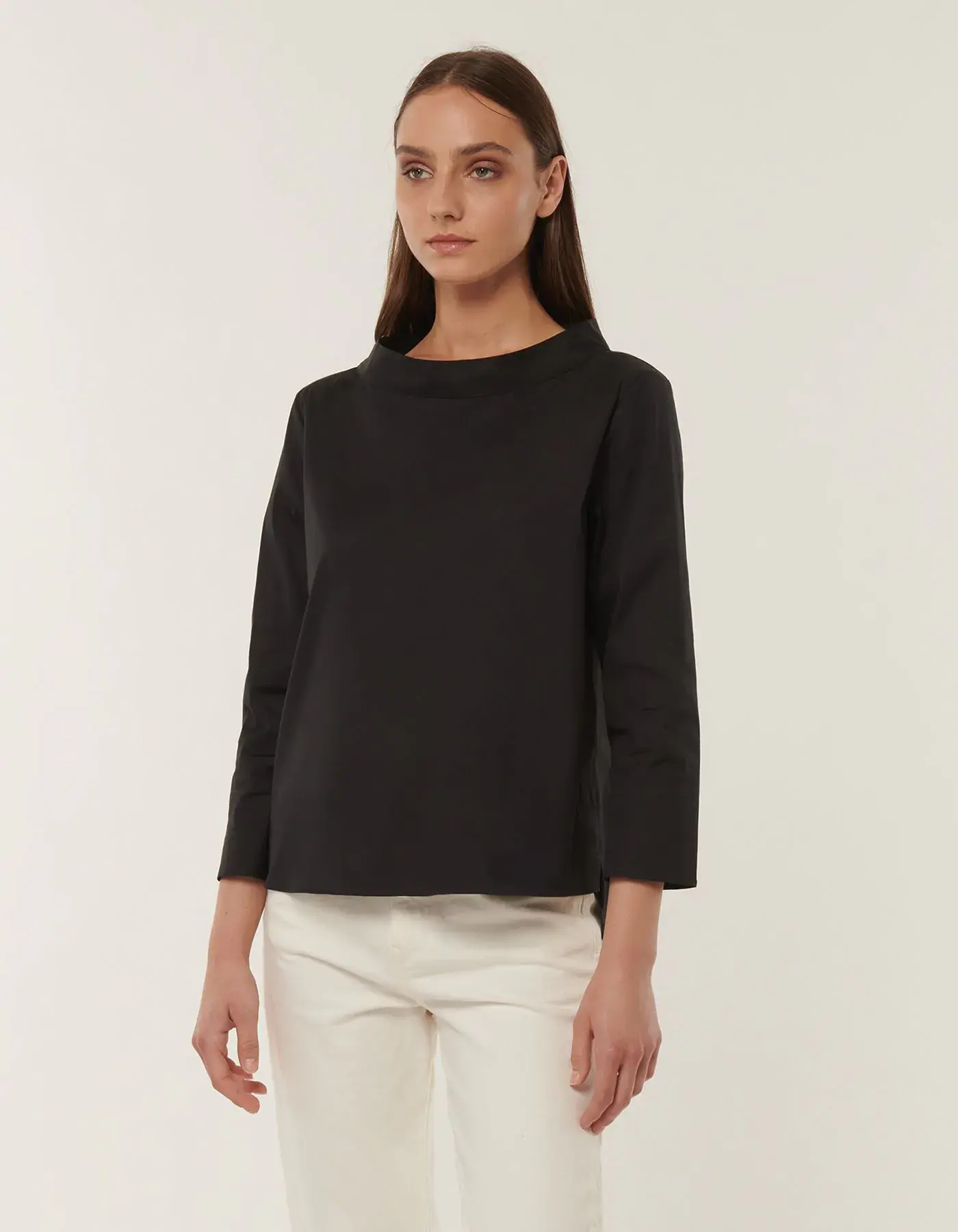 De poplin Clara iconische blouse met lange mouwen en een moderne trapeziumvormige vorm, ontworpen om elke outfit die up-to-the-minute touch te geven. De coldhals is breed maar subtiel, een detail dat een vleugje klasse toevoegt aan een kledingstuk dat gemakkelijk te dragen is.