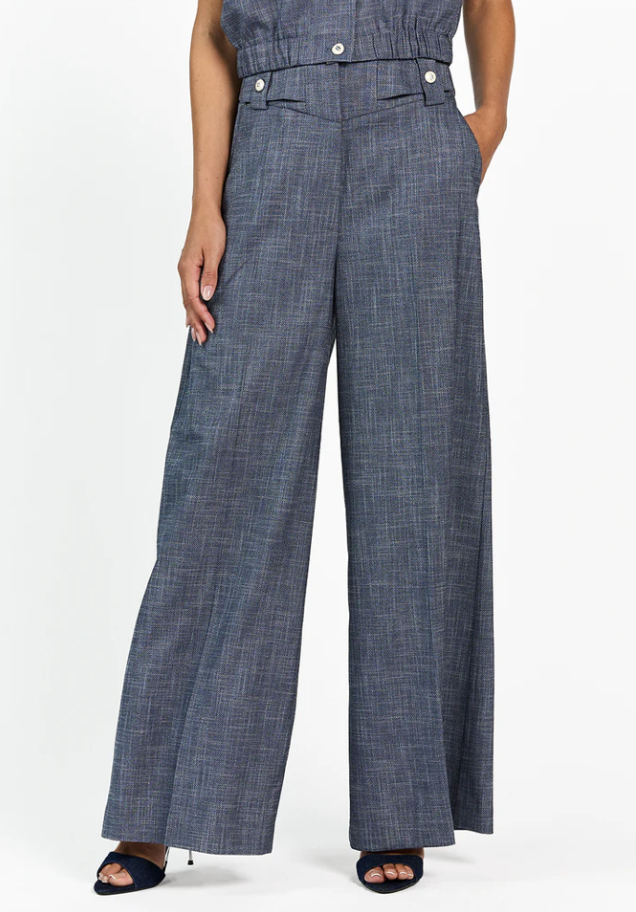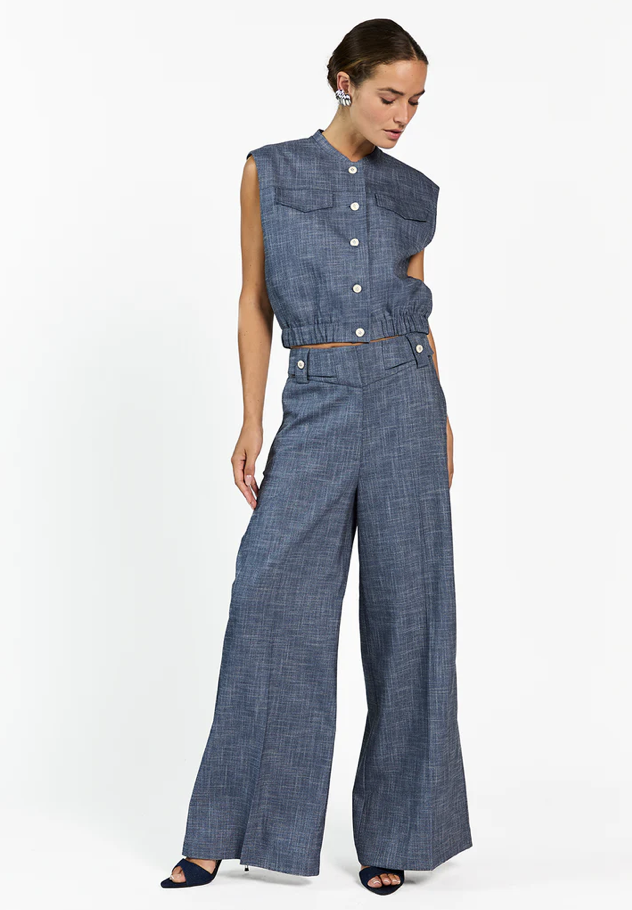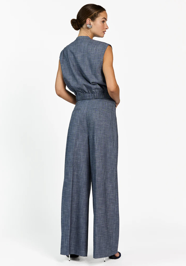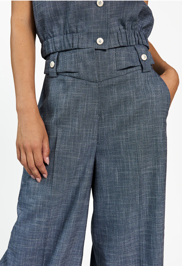 De Nore Broek heeft een rechte, wide leg fit en is gemaakt van een soepelvallende stof met subtiele structuur. De knoopdetails en de geplooide tailleband geven het design net wat extra’s. Draag met het Lauryn Jack voor een co-ord set of combineer met het Olivia Gilet voor een iets lichtere look.