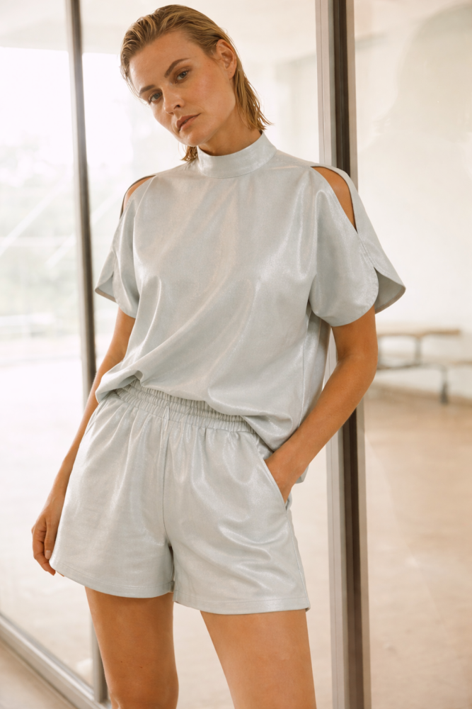 Deze combinatie laat zien hoe moeiteloos stijl en comfort samenkomen. De MetteS6 short en de bijpassende MaeviaS6 top van Aimée The Label vormen samen een frisse, moderne set in een zachte lichtblauwe tint met een subtiele zilveren glans.