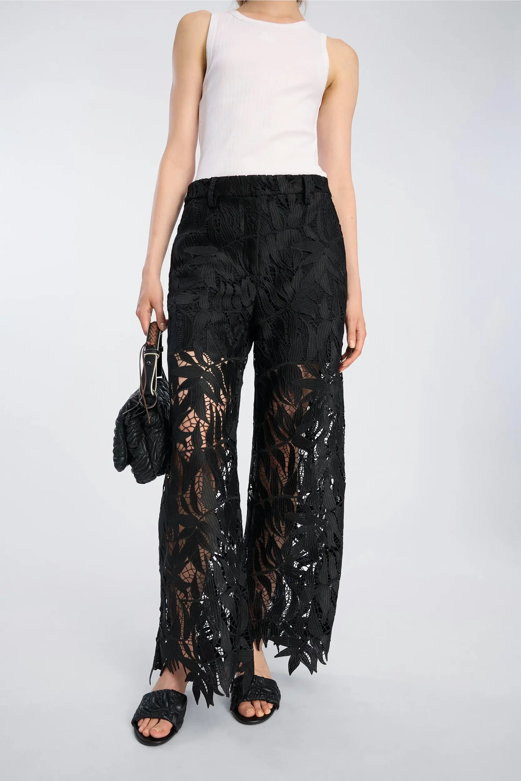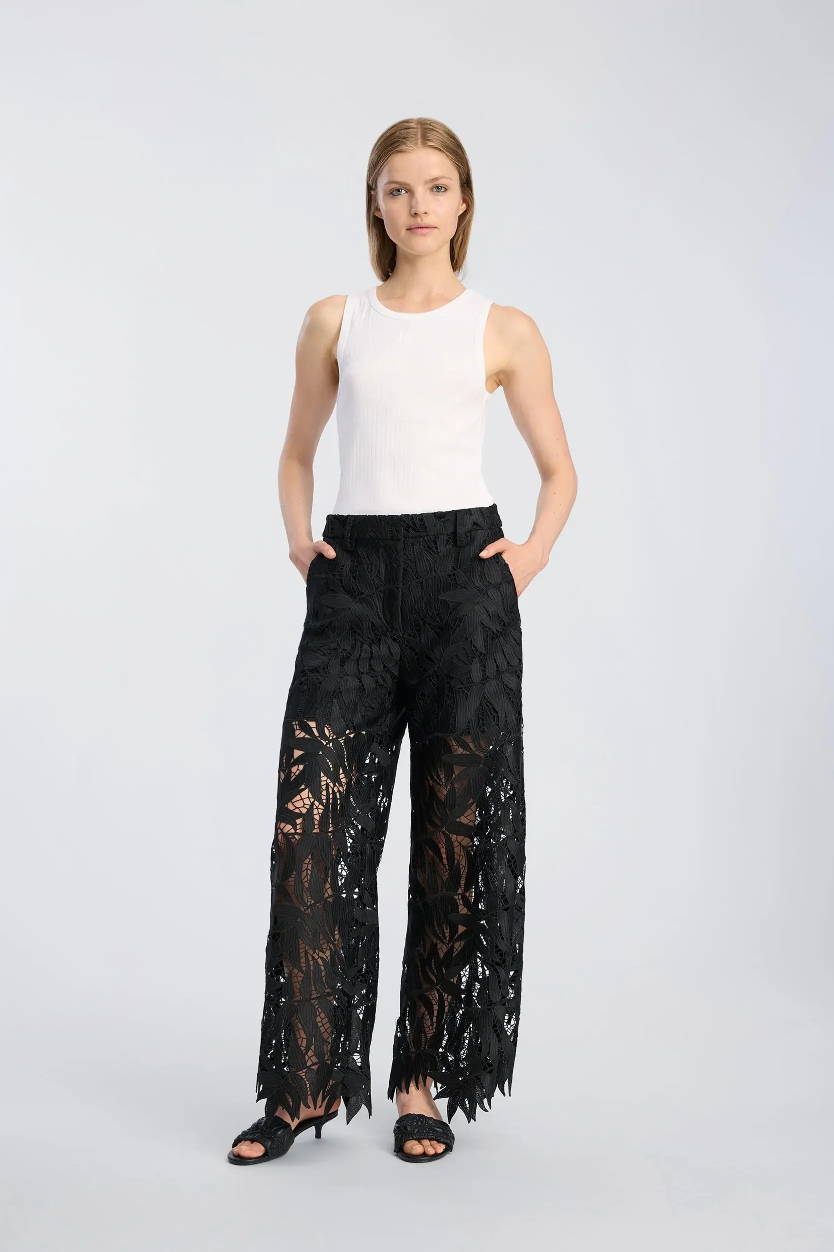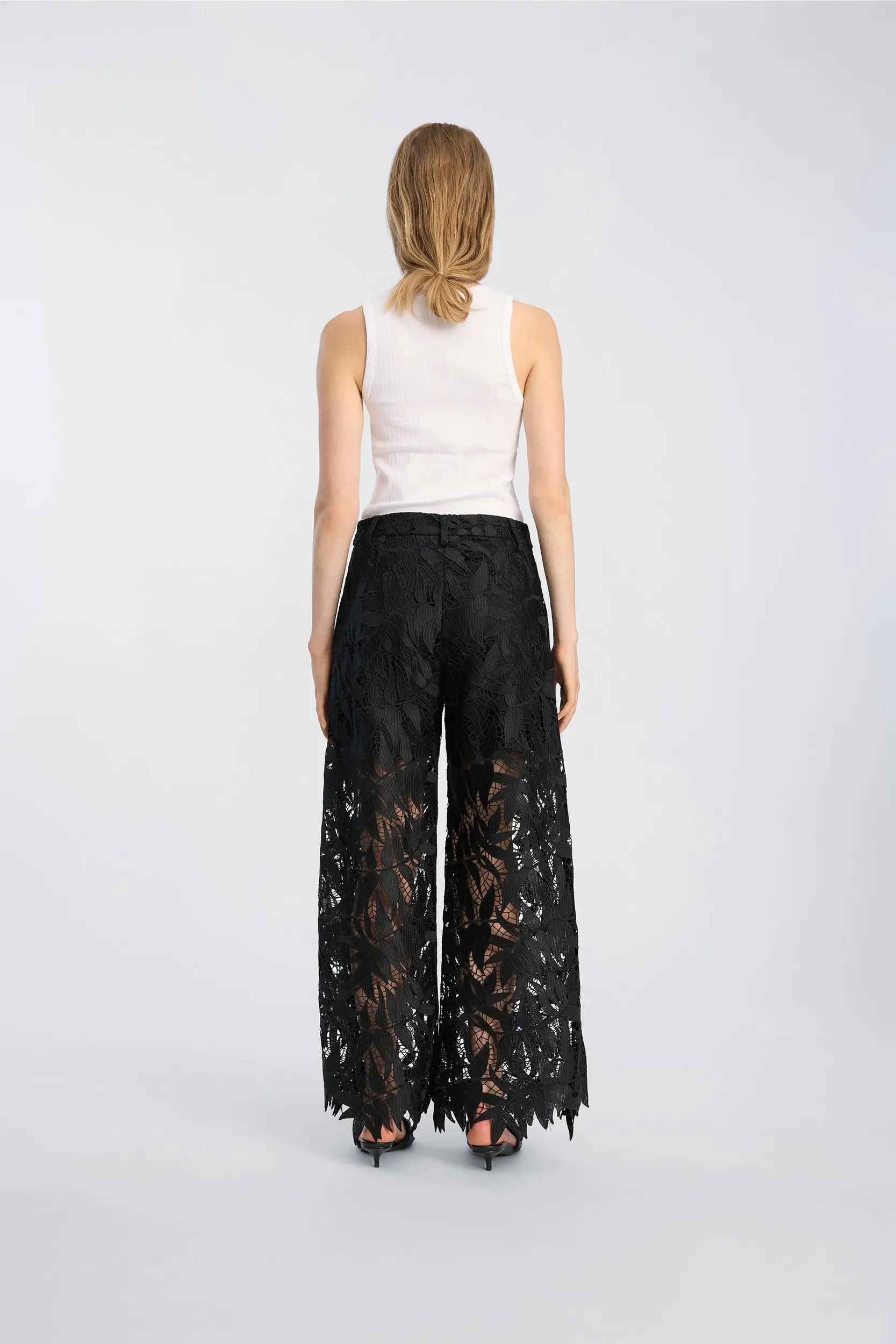 Broek van kant met een gedurfd bladmotief en lichte transparantie langs de pijpen. Het model heeft een elastische taille, rechte pijpen en onafgewerkte randen die de vorm van het motief volgen. Een ontwerp dat zowel op zichzelf gedragen kan worden als in combinatie met onze BUBBLE-top.