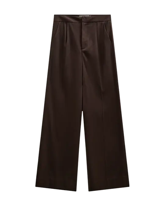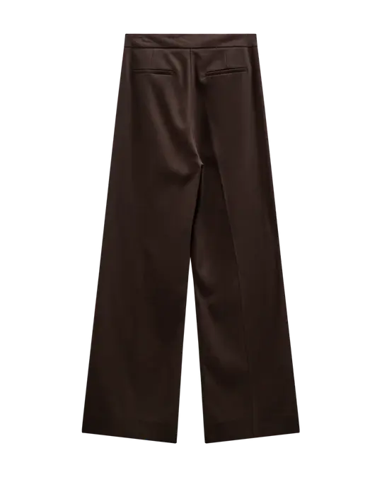 zijzakken, een losse pasvorm en plooien en plooien in de rechte, brede benen. Een detail dat een verfijnde touch toevoegt.