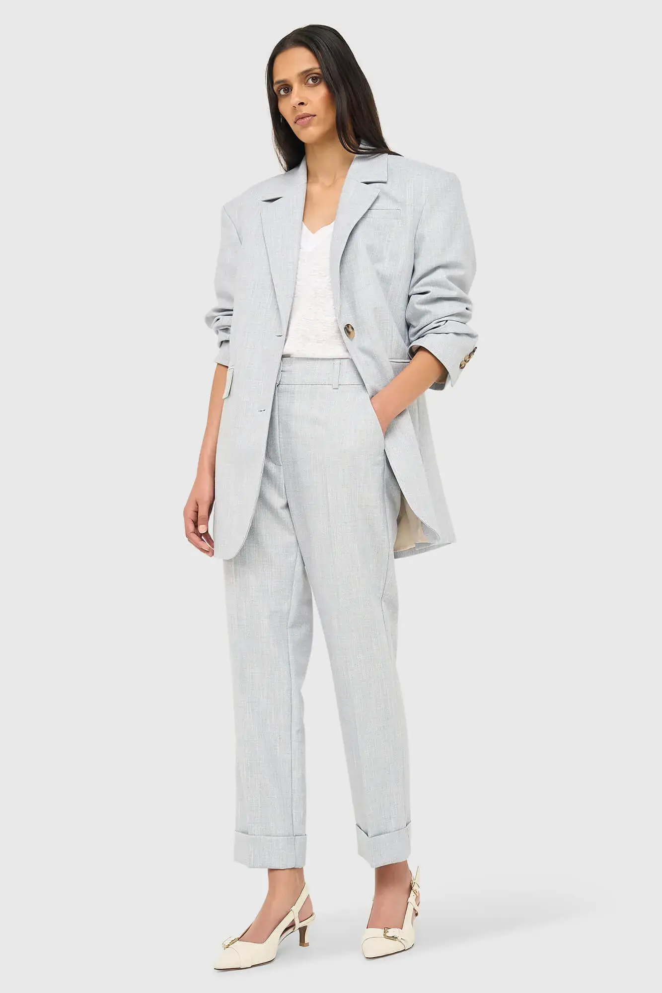 Dankzij de rijke blauwe kleur en het subtiele lurexdetail kun je deze dames broek eindeloos combineren. Draag de pantalon met een zachte knit uit onze knitwear collectie of kies voor een verfijnde blouse voor een elegante uitstraling. Voor een extra gelaagde look combineer je de SEAN met een van onze blazers. Op zoek naar een casual twist? Dan past een top uit de basics essentials collectie hier moeiteloos bij.