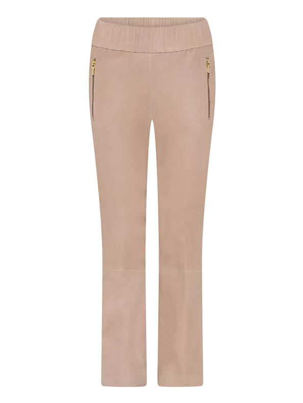 Minimalistisch, zacht en met een luxe touch. De Doa broek is gemaakt van soepel leer in een zachte zandtint. De elastische tailleband en rechte pijpen zorgen voor een comfortabele pasvorm met een verfijnde uitstraling. leuk te combineren met de leren Soho Jack of met de Aniza jacket van Gustav