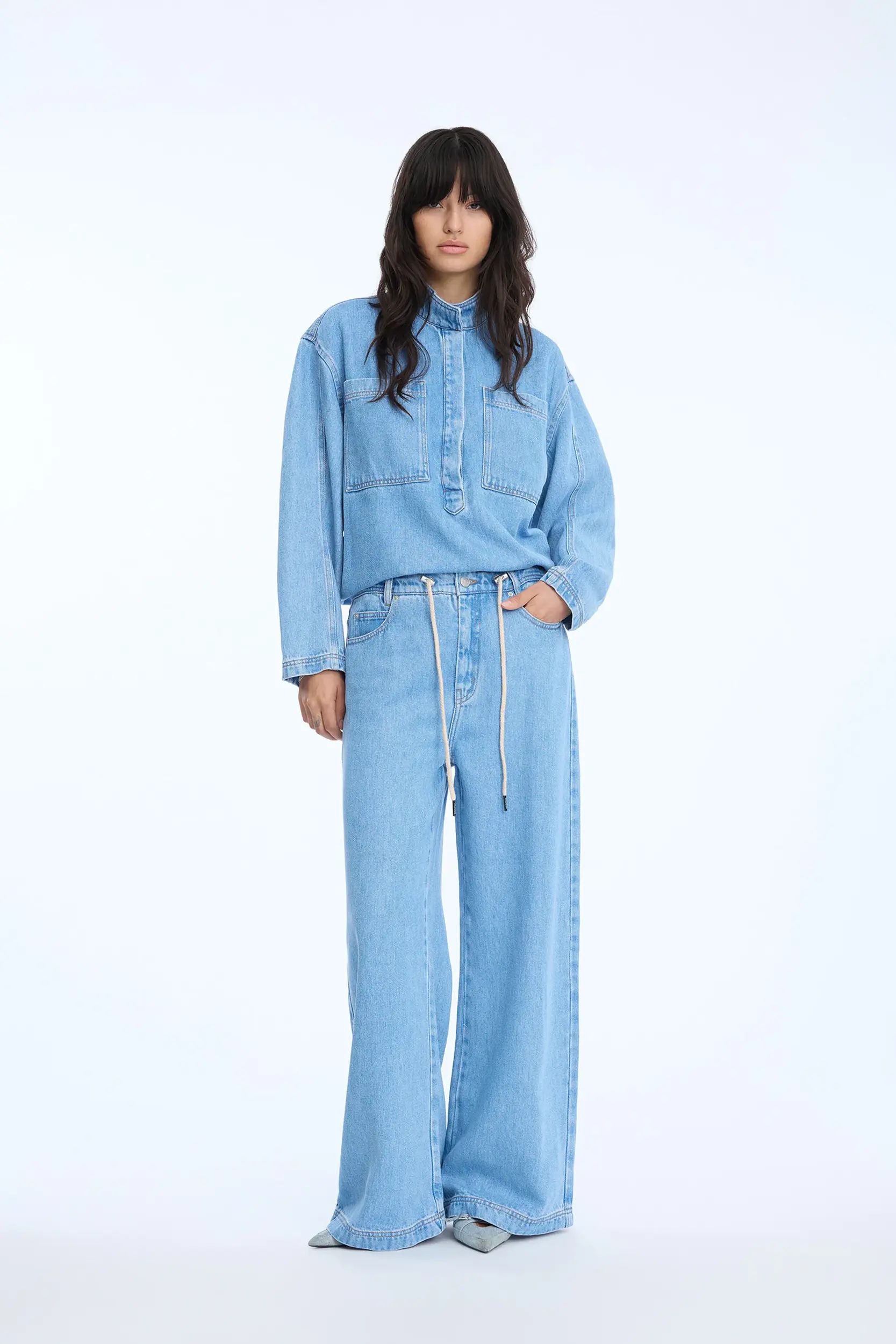 Deze jeans is er zo één waar je meteen verliefd op wordt. De lichte blauwe wassing geeft een frisse, moderne uitstraling, terwijl het elegante koorddetail in de taille zorgt voor nét dat beetje extra verfijning.