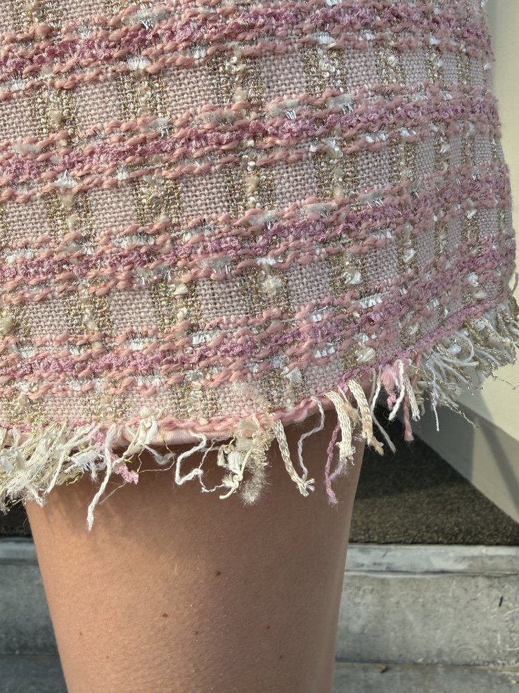 De Stella tweed short in lichtroze is een perfecte combinatie van elegantie en comfort. De rijke tweed stof met zachte roze tinten, subtiele gouden accenten en verfijnde structuur geeft deze short een luxe uitstraling met een moderne twist.