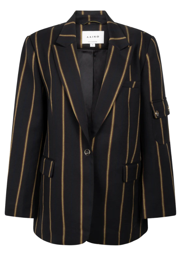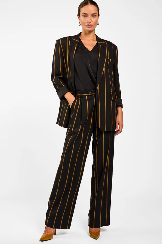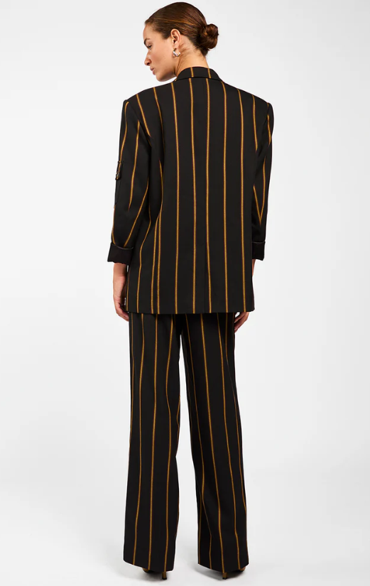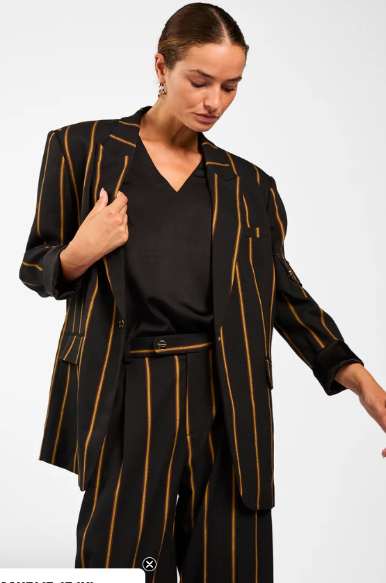 De Kendal blazer met strepen is de perfecte keuze om een statement te maken. Deze oversized blazer combineert klassieke elegantie met een modern accent dankzij het pocketdetail op de mouw. Uitgevoerd in het zwart met strepen in donkerblauw, geel en bruin. Draag het met de bijpassende broek Nore.