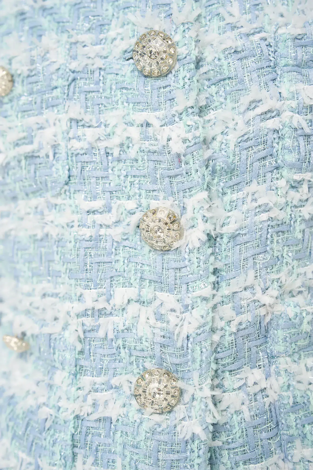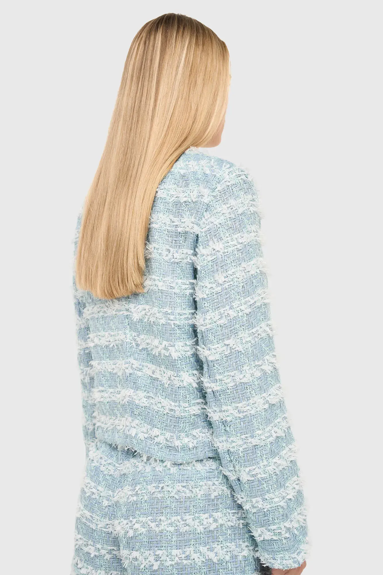 De dames blazer jasje tweed LAURENT blauw van JANICE is een luxe dames blazer ontworpen voor vrouwen die houden van tijdloze elegantie en hoogwaardige afwerking. Dit jasje heeft een chanel fit met een ronde hals, een rechte pasvorm en een lengte die tot op de heupen valt. De rijke tweedstructuur en de fraaie blauwe tint geven het ontwerp een klassieke en tegelijkertijd moderne uitstraling. Dankzij het gebruik van 100% polyester voelt het jasje licht en comfortabel aan, terwijl de structuur zorgt voor een verfijnd en stijlvol geheel.