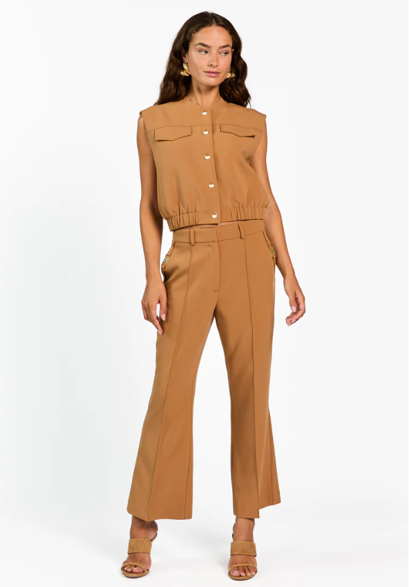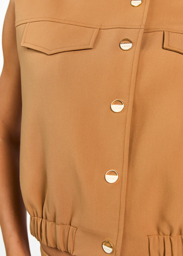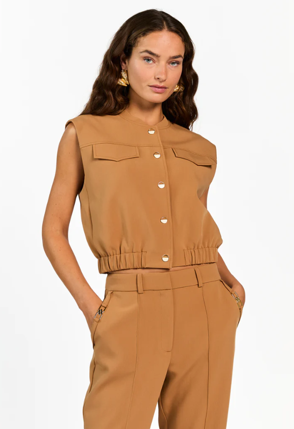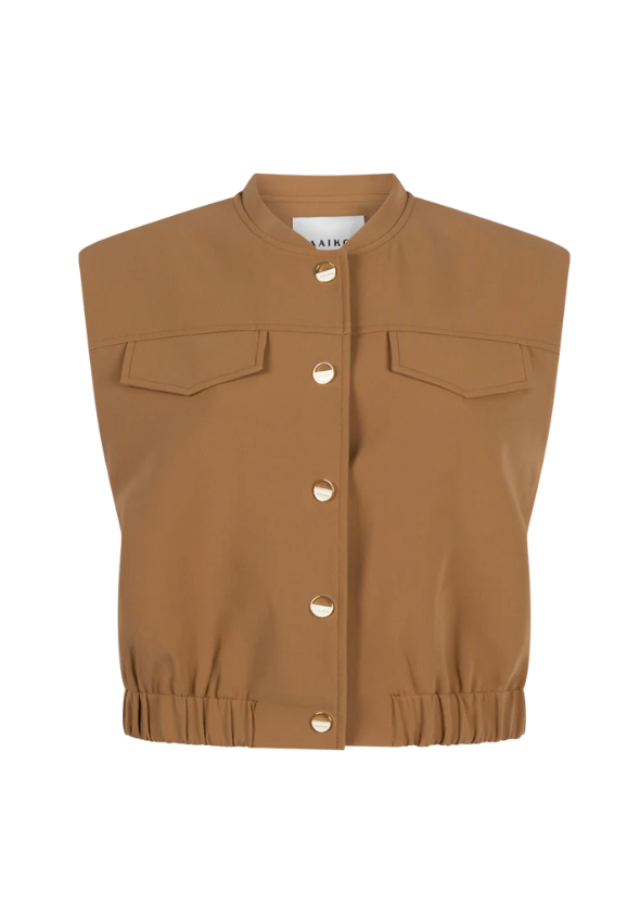 Deze mouwloze top heeft een moderne en stoere uitstraling dankzij het korte model en de stevige stof. De ronde hals en knoopsluiting aan de voorzijde zorgen voor een nette afwerking. De borstzakken en elastische zoom geven het ontwerp een eigentijdse touch. Perfect om te dragen als statement item of combinatie met de Linde broek.