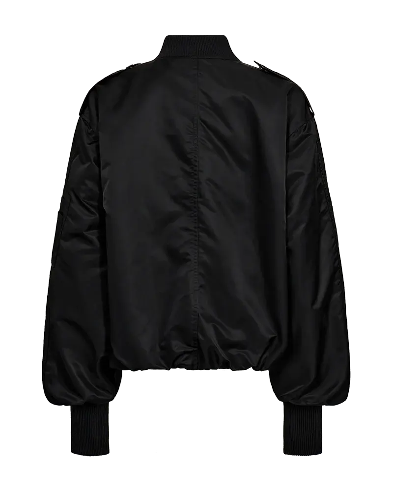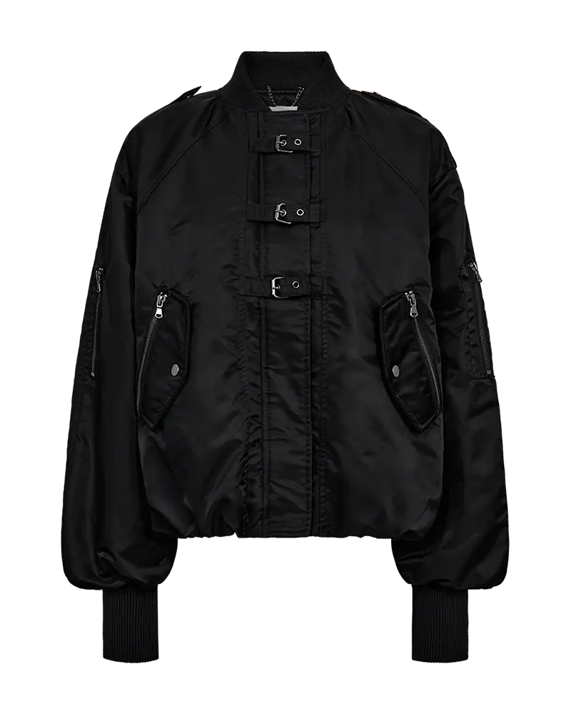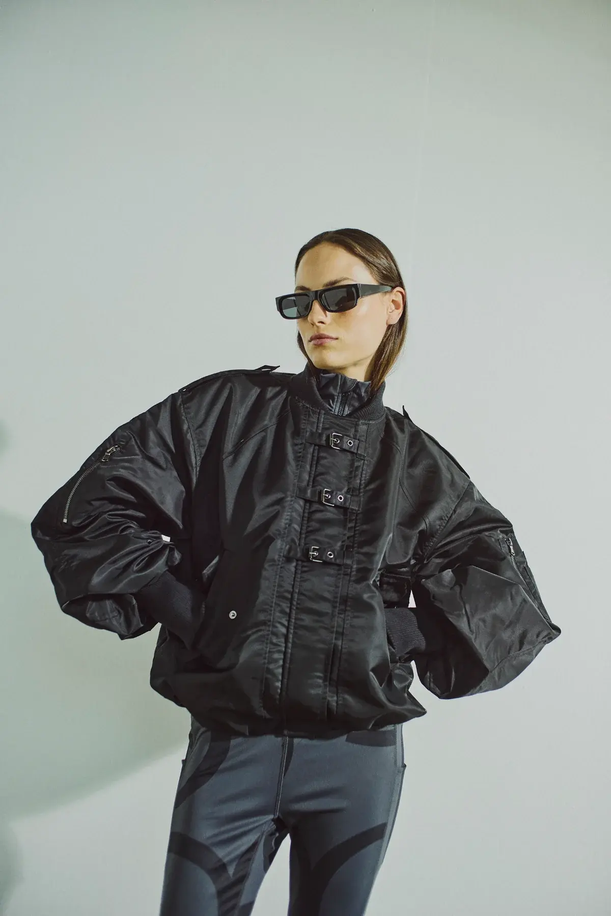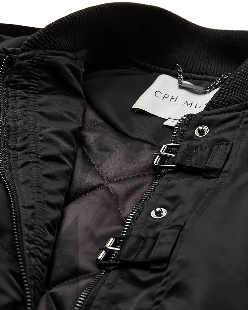 CMBOMBER-JACKET is een gewatteerde bomberjack van een premium materiaal met een voering met logopatroon, ritszakken aan de voorkant en mouwen, een drukknoop en ritssluiting met gespen, lange ballonmouwen en een elastische zoom die de brede pasvorm benadrukt.
