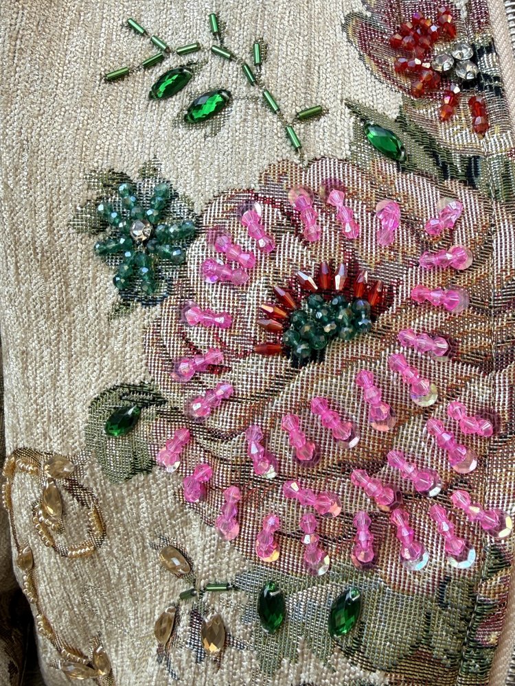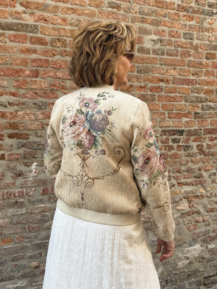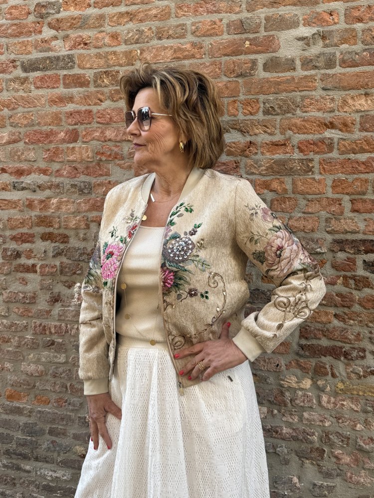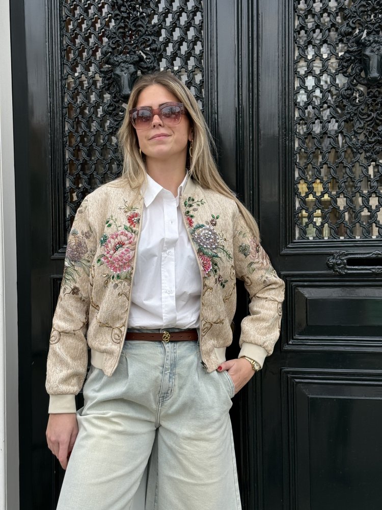De Kenny jacket is allesbehalve standaard. De zachte, licht glanzende stof in een warme ivoor- en goudtint vormt de perfecte basis voor het rijke borduurwerk met bloemen en verfijnde kraaldetails. De combinatie van zachte kleuren met subtiele glans en handmatige afwerking geeft deze jas een exclusieve en luxe uitstraling.