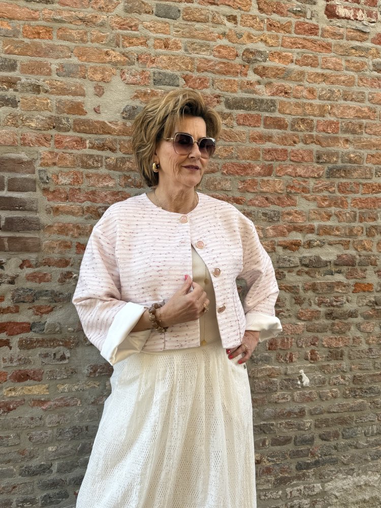 De mooie, ronde halslijn en de bijzondere knopen met een zachte roze steenlook zorgen voor een chique en verfijnd detail. De licht boxy, ruimvallende pasvorm zorgt ervoor dat het jasje comfortabel draagt en mooi los om het lichaam valt. Je combineert comfort met klasse alsof het vanzelf gaat.