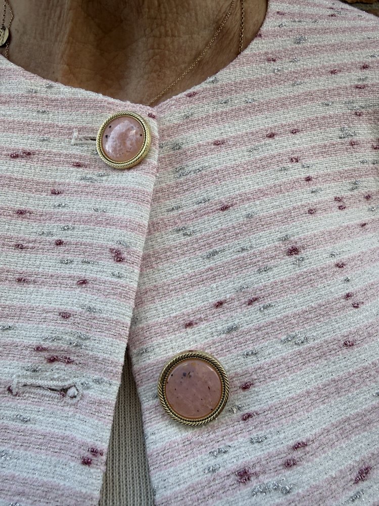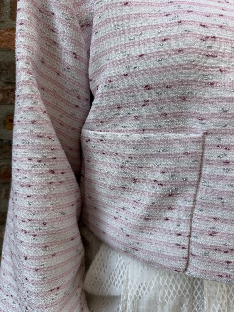 De Vittoria Dream Catcher jacket in lichtroze is een echte musthave voor wie houdt van subtiele luxe. De fijne structuur in de stof, gecombineerd met zachte roze tinten en zilveren accenten, geeft dit jasje een elegante en frisse uitstraling.