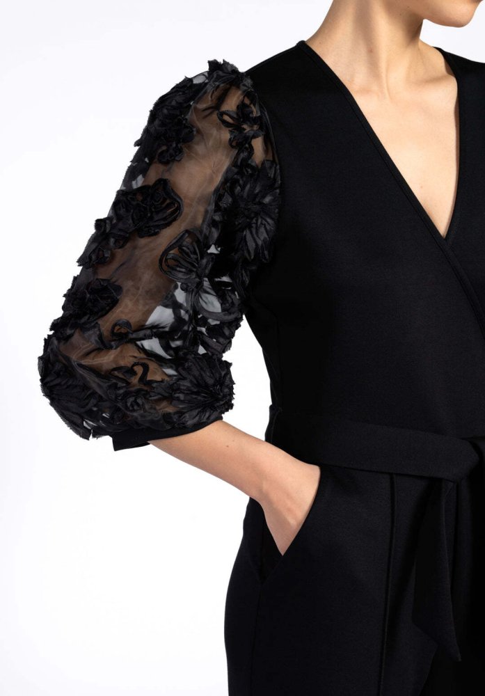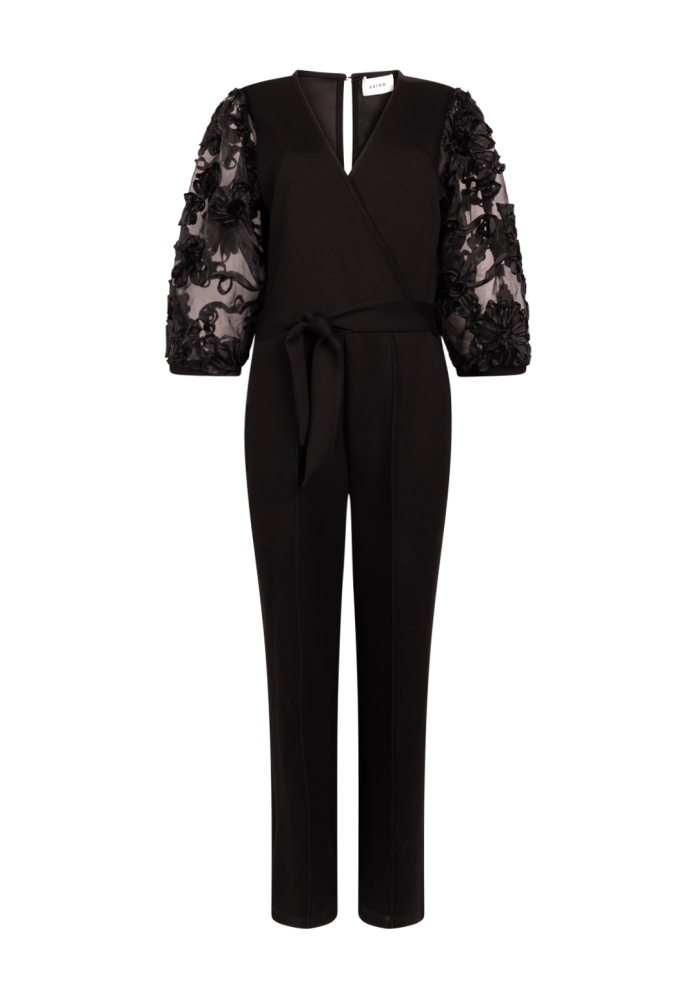 De Lizeth jumpsuit heeft een elegante aangesloten pasvorm met een diepe V-hals en een strikceintuur die het silhouet accentueert. De absolute blikvanger zijn de volumineuze, transparante mouwen van organza, rijkelijk versierd met bloemenapplicaties in ton-sur-ton zwart. De rechte pijpen zorgen voor een tijdloos en flatterend silhouet, terwijl het materiaal zorgt voor draagcomfort en een luxe uitstraling.