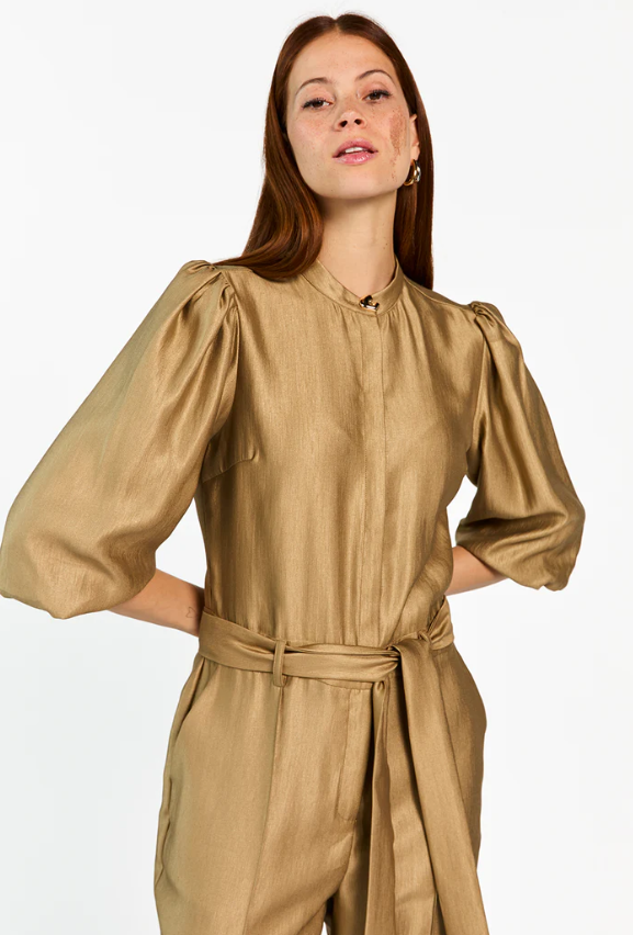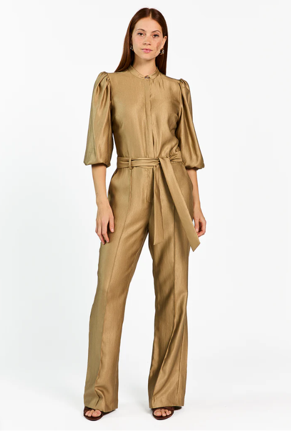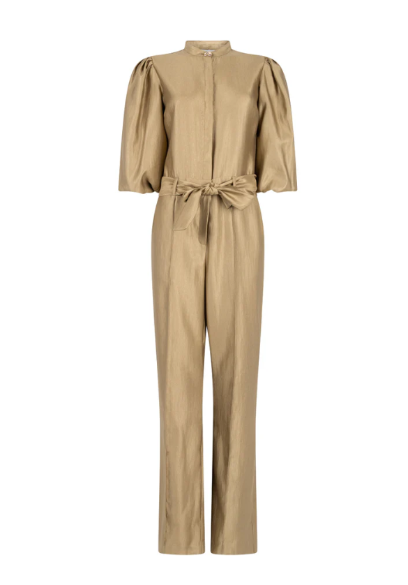 De Katy Jumpsuit is een opvallend item dat moeiteloos stijl en comfort combineert. De zachte glanzende stof zorgt voor een chique uitstraling, terwijl de rechte pijpen en ceintuur in de taille het silhouet mooi in balans brengen. De pofmouwen en het gouden knoopdetail bij de hals geven de jumpsuit net dat beetje extra.