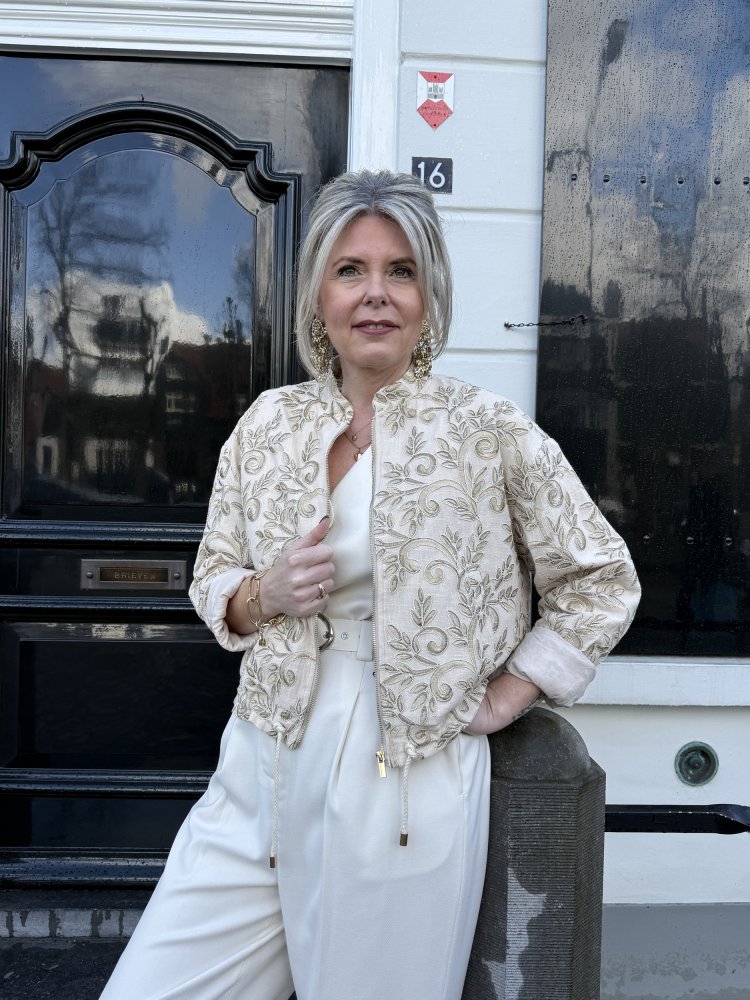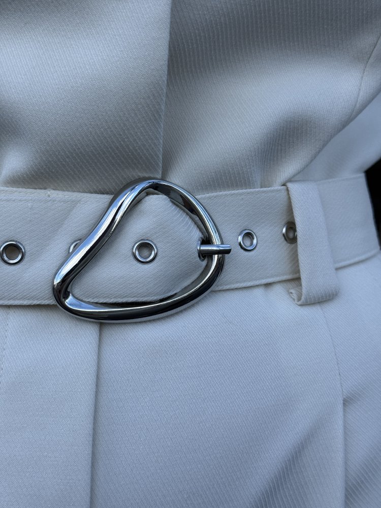 De bijpassende ceintuur met opvallende gesp accentueert subtiel de taille en geeft je silhouet precies die mooie balans tussen kracht en zachtheid.