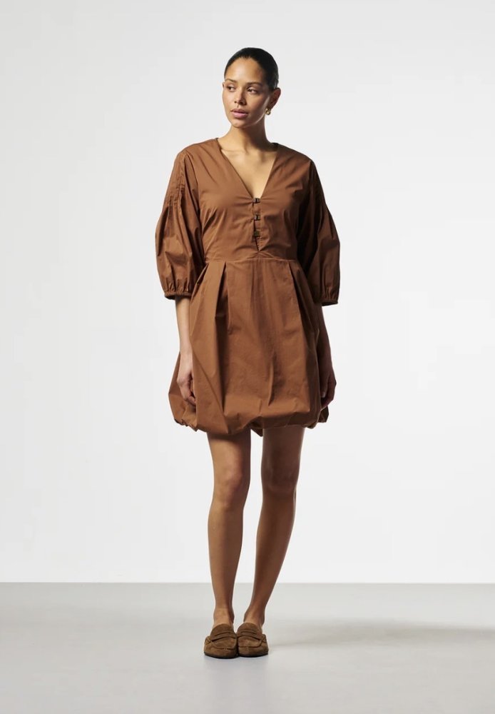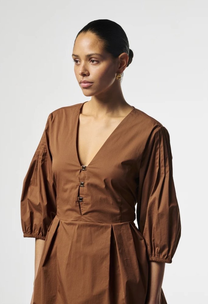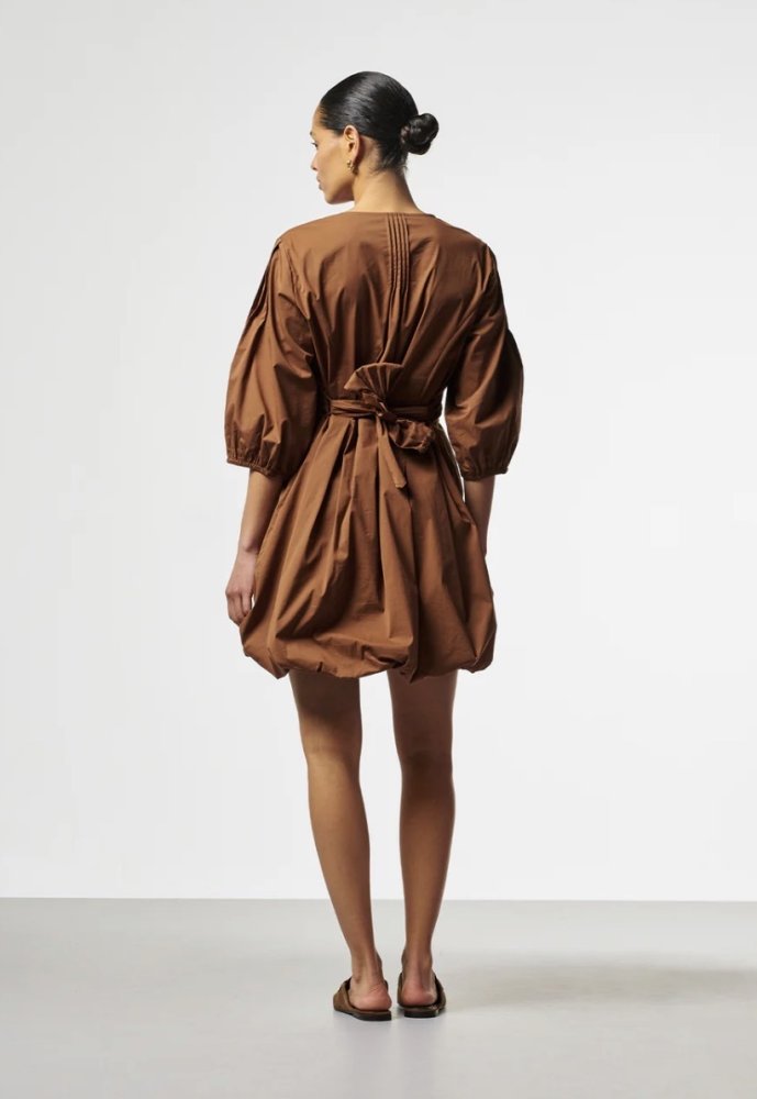 De Isolde jurk van Aaiko is zo’n item dat direct opvalt door haar krachtige, vrouwelijke uitstraling. De warme bruintint geeft een rijke en stijlvolle basis, terwijl de volumineuze rok en verfijnde details zorgen voor een moderne, modieuze look.