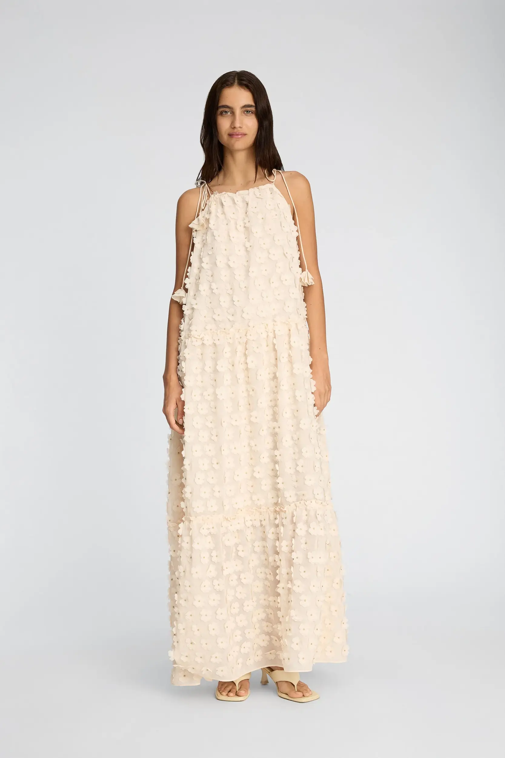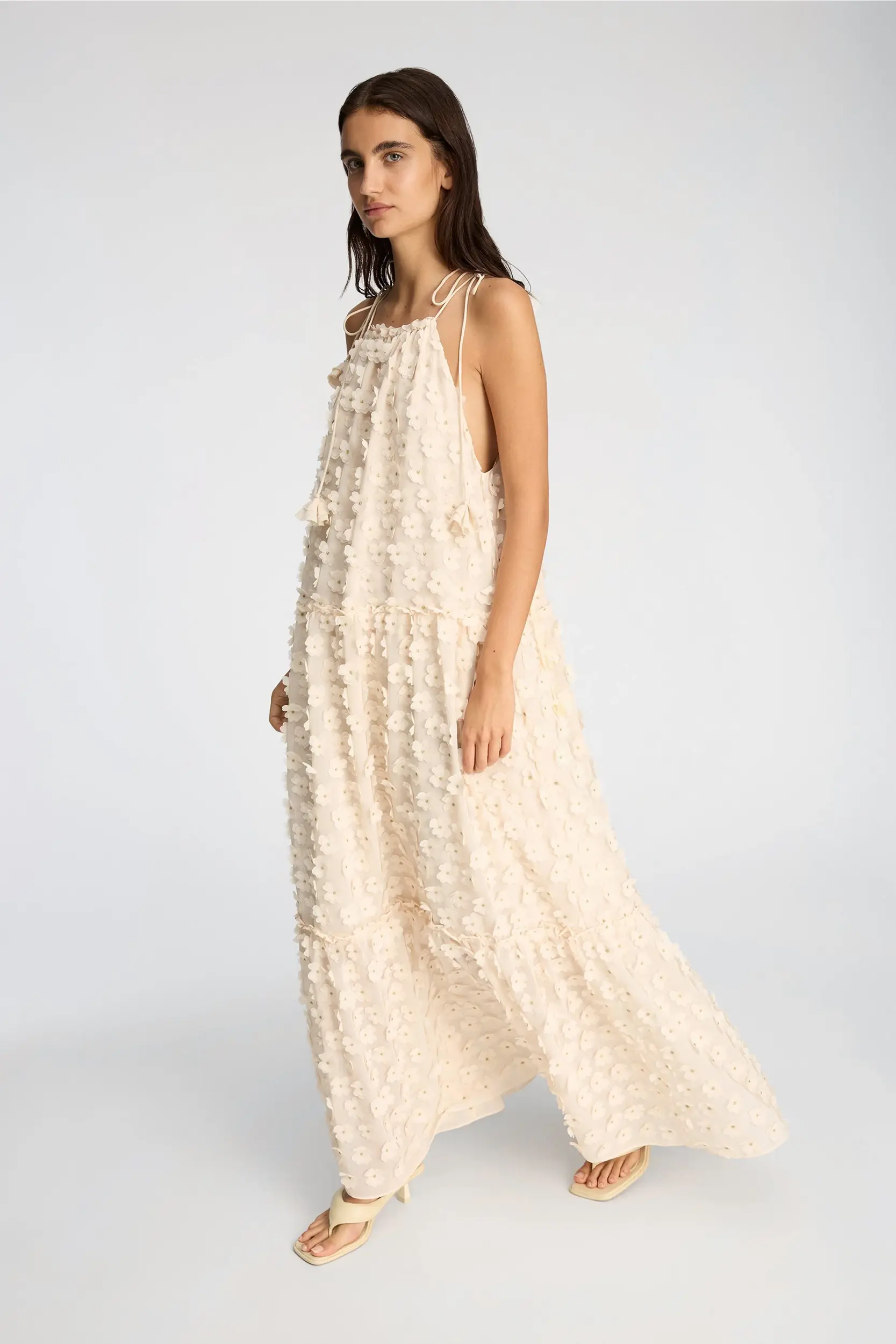 Jurk gemaakt van een lichte, gestructureerde stof met aangebrachte bloemrijke versieringen. Het heeft een halternekontwerp met verstelbare strikjes, een losse pasvorm en zacht geplooide lagen die een volumineuze val creëren.