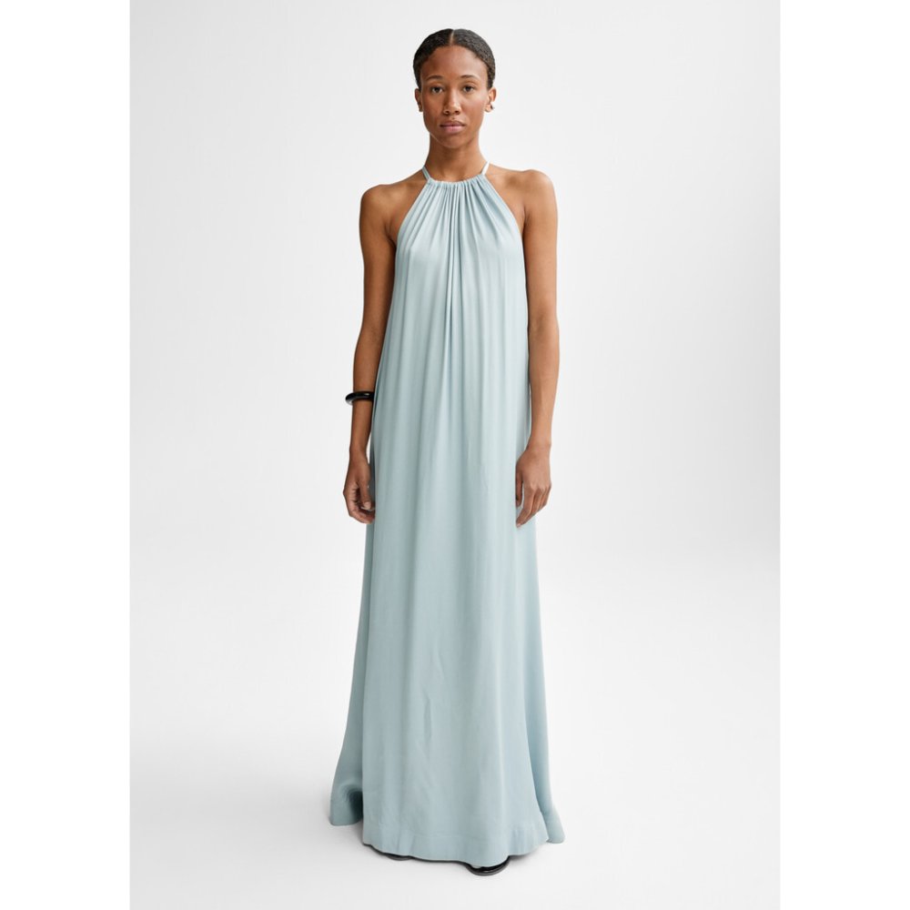 De Dalina Viscose Dress is een lange, vloeiende jurk gemaakt van 100% viscose met een zwaar laken. De halslijn kan worden vastgemaakt voor een gepolijste look of open gelaten voor een ontspannen gevoel.