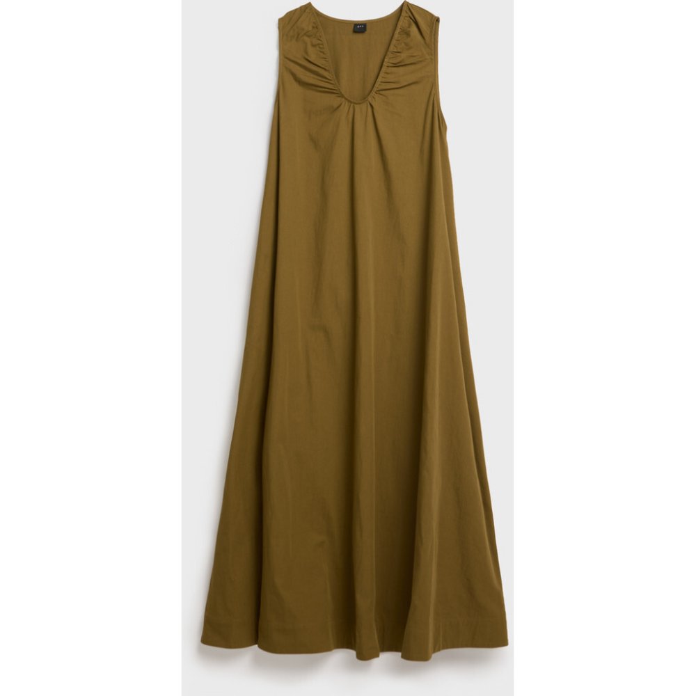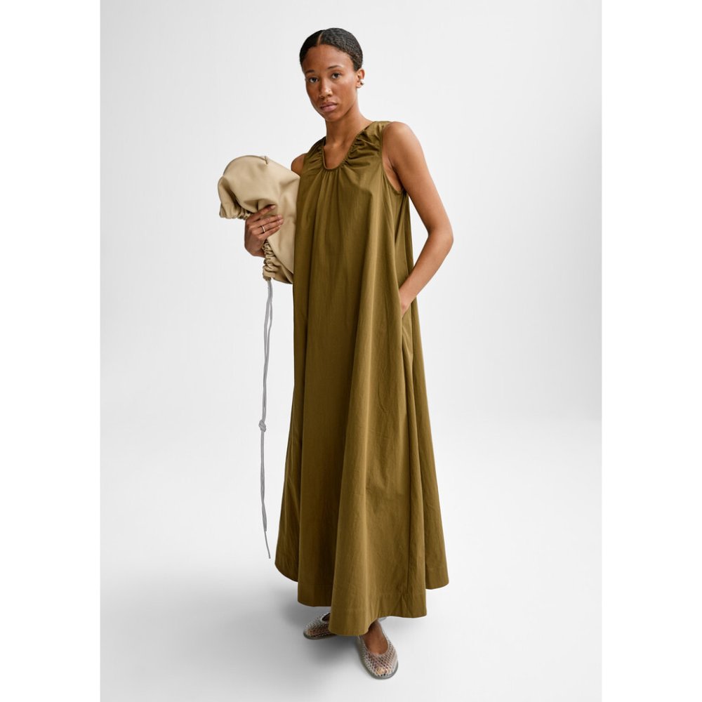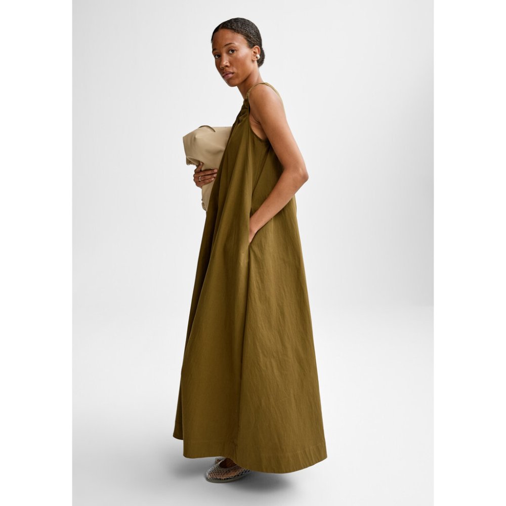 Samantha Cotton Dress is een volumineuze jurk gemaakt van zacht, zwaar katoen. Het heeft zijzakken en een diepe U-vormige halslijn met plooien, waardoor de halslijn een opvallend kenmerk van de jurk is.