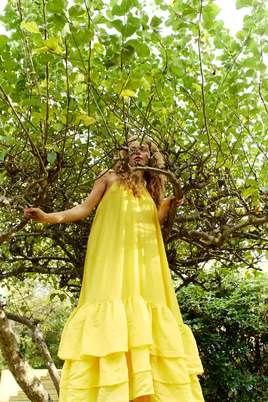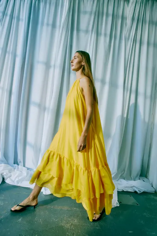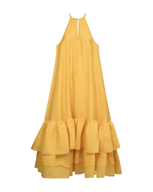 De jurk heeft een losvallende A-lijn met veel volume, waardoor je een luchtig en flatterend silhouet creëert. De gelaagde zoom met ruches geeft extra beweging en maakt deze jurk perfect voor zowel een zonnige dag als een stijlvolle avond.