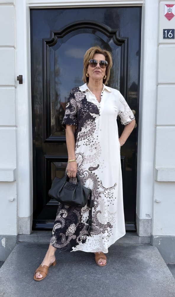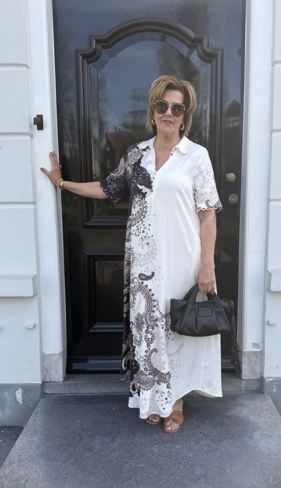 Deze lange jurk van Gustav is voor de vrouw die durft te kiezen voor stijl met karakter. De combinatie van zachte ecru tinten met diep zwart in een verfijnde paisley print geeft deze jurk een krachtige, maar toch elegante uitstraling.