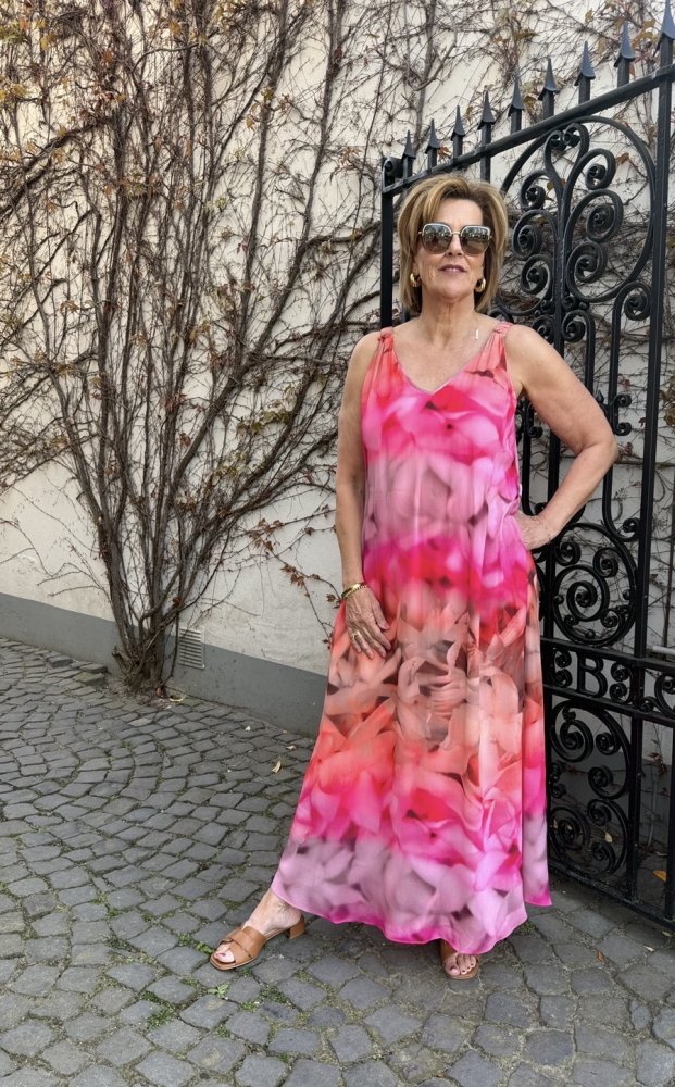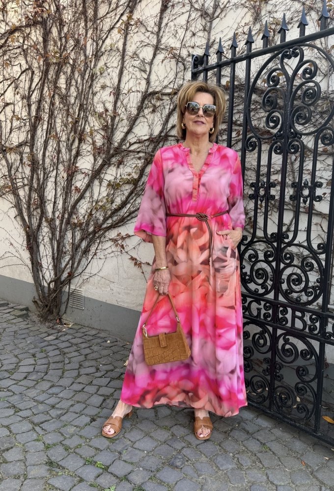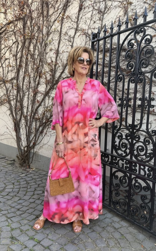 Met deze lange jurk van Gustav kies je voor kleur, flair en zelfvertrouwen. De levendige print in warme roze- en koraaltinten geeft direct energie aan je look, terwijl de zachte, vloeiende stof zorgt voor een elegante en ontspannen uitstraling.